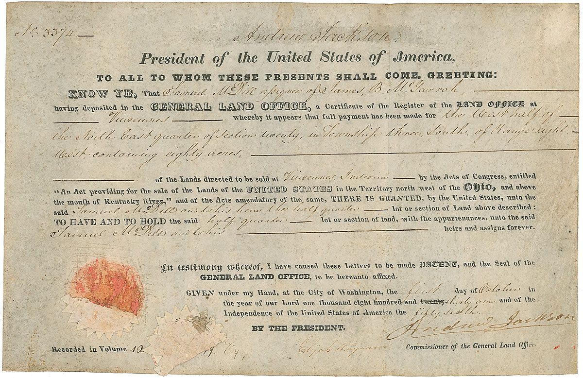 Partly-printed vellum DS as president, one page, 13.75 x 9, October 1, 1831. President Jackson grants Samuel M. Dill a parcel of land in “the West half of the North East Quarter of section twenty…of the Lands directed to be sold at Vincennes, Indiana.” Signed at the conclusion by Jackson and countersigned by Commissioner of the General Land Office Elijah Hayward. White paper seal is torn with one half detached from the document. Removably encapsulated in a Mylar sleeve. In very good condition, with two vertical storage folds, scattered foxing and soiling, and aforementioned tear to the seal.