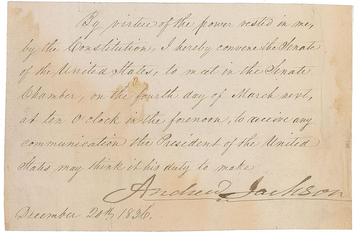 Manuscript DS as president, one page, 6.25 x 4, December 20, 1836. Document reads, in full: “By virtue of the power vested in me, by the Constitution, I hereby convene the Senate of the United States, to meet in the Senate Chamber, on the fourth day of March next, at ten o’clock in the forenoon, to receive any communication the President of the United States may think it his duty to make.” Document is affixed to an identical size card. In very good condition, with trimmed edges, dampstaining to portion of document, some lightly over signature, and a few ripples.
