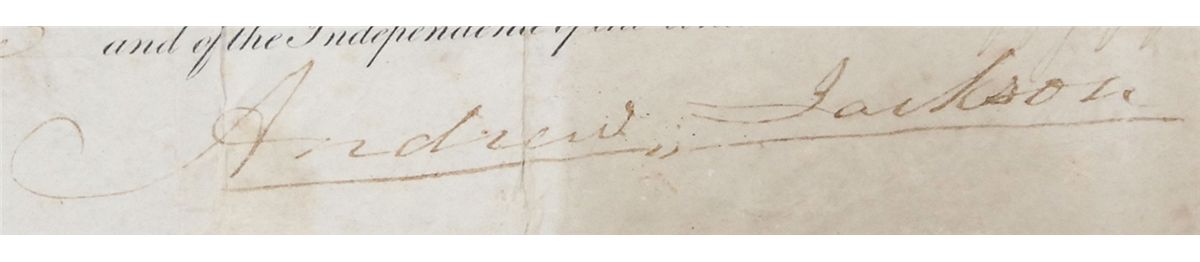 Partly-printed DS as president, one page, 15.5 x 9.5, June 25, 1831. President Jackson grants 80 acres of land in Alabama to Benjamin Clements. Signed at the conclusion by Jackson and countersigned by Commissioner of the General Land Office Elijah Hayward. Vertical folds, handwritten portions fairly light, but still mostly legible, some paper loss to edges, and soiling along bottom, some affecting end of signature, otherwise very good condition. The seal is slightly worn and toned, but intact.