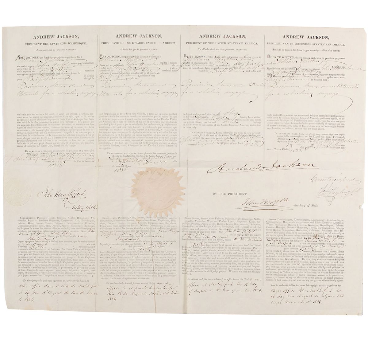 Partly-printed DS as president, one page, 20 x 16, August 1, 1836. Four-language ship’s papers issued to “William Whitten, Jr., master or commander of the Ship called John Howland…lying at present in the port of New Bedford…and laden with Provisions Stores and Utensils for a whaling voyage.” Signed in the middle by Jackson and countersigned by Secretary of State William Forsythe. Tape reinforcement to fragile folds, partial separations to the folds, two folds lightly passing through signature, as well as some small area of paper loss along central horizontal fold, otherwise very good condition. The seal is uniformly toned, but intact. The John Howland would be lost in the Arctic almost 50 years later.
