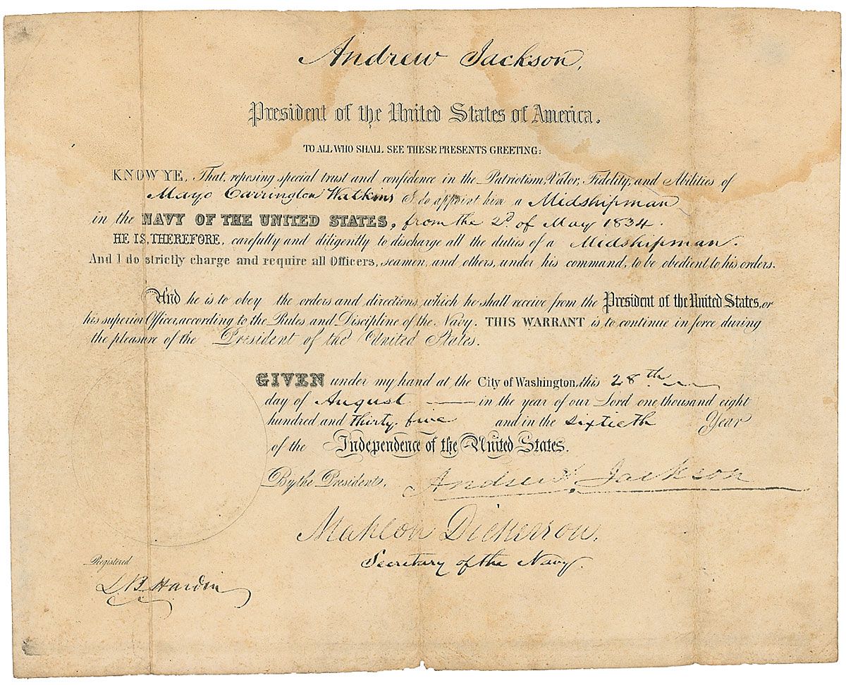 Partly-printed vellum DS as president, one page, 10 x 8, August 28, 1835. President Jackson appoints Mayo Carrington Watkins as “a Midshipman in the Navy of the United States.” Signed at the conclusion by Jackson and countersigned by Secretary of the Navy Mahlon Dickerson. Seal is not present and appears to never have been affixed. In very good condition, with three vertical folds (two passing through single letters of the signature), dampstaining to upper corners, and a bit of irregular ink adhesion to signature. A seldom-seen and desirable format in the era of America’s scaled-back naval forces following the War of 1812.