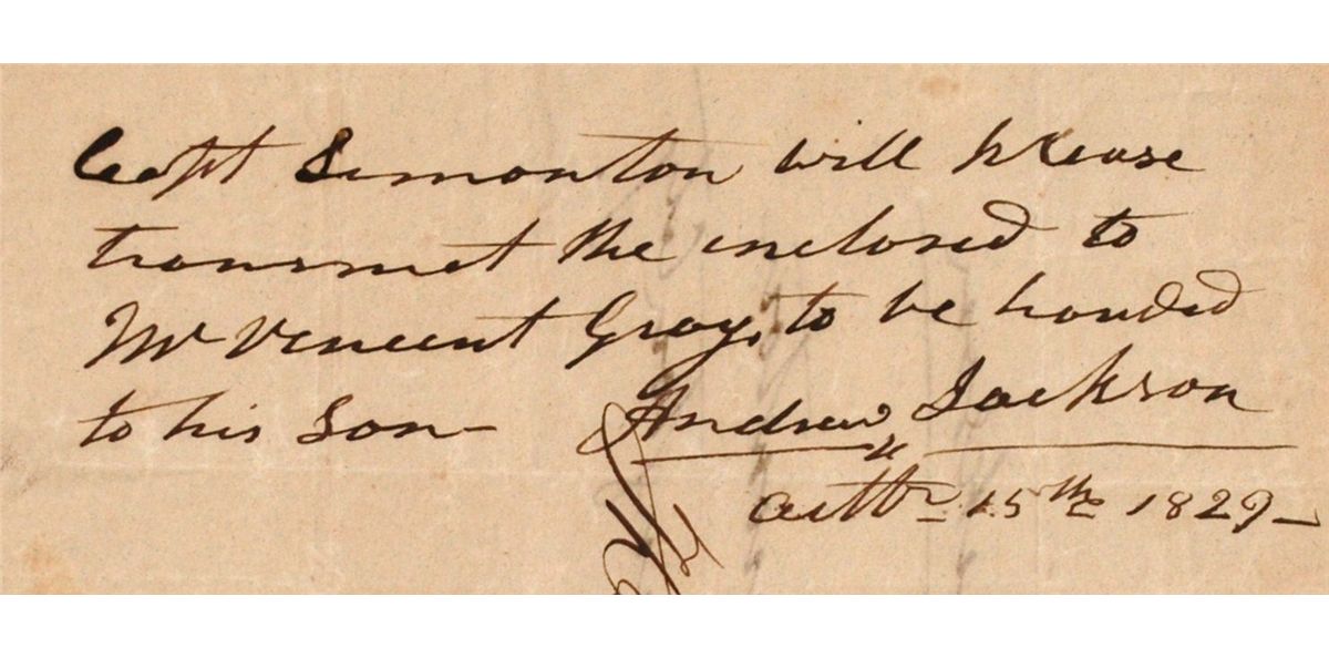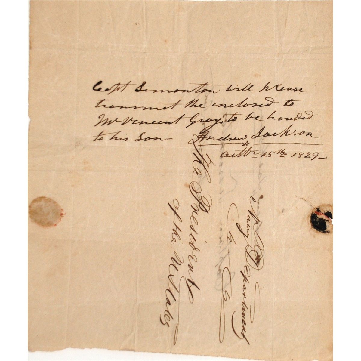 Andrew Jackson: ADS signed twice by the president. On an address leaf sent by the Navy Department to the President of the United States, Jackson has penned: “Capt. Simonton will please transmit the enclosed to Mr. Vincent Gray to be handed to his son. Andrew Jackson October 25th 1829.” On the verso Jackson wrote his franking signature and the address “Captain Simonton, Washington City.” With remnants of a red seal.