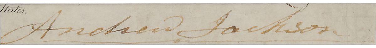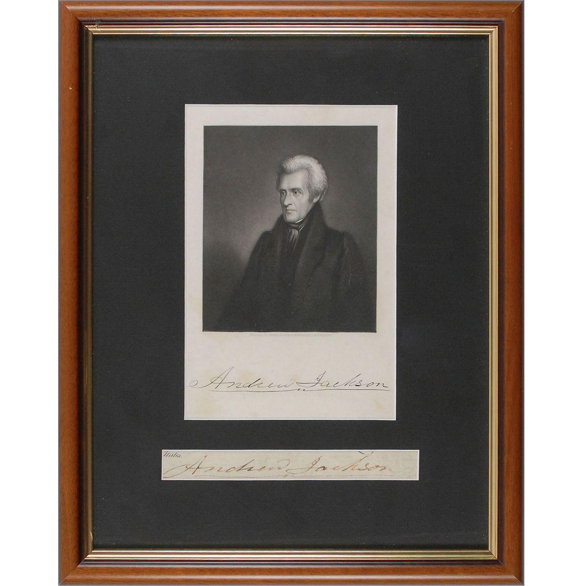 Large ink signature, as president, “Andrew Jackson,” on an off-white slip clipped from a document. Matted and framed with a portrait of Jackson bearing a pre-printed signature to an overall size of 11.5 x 15. In fine condition, with intersecting folds, one lightly passing through a couple letters of signature.
