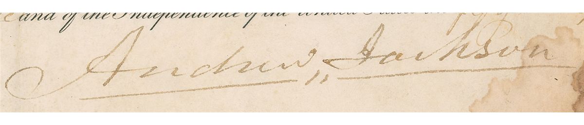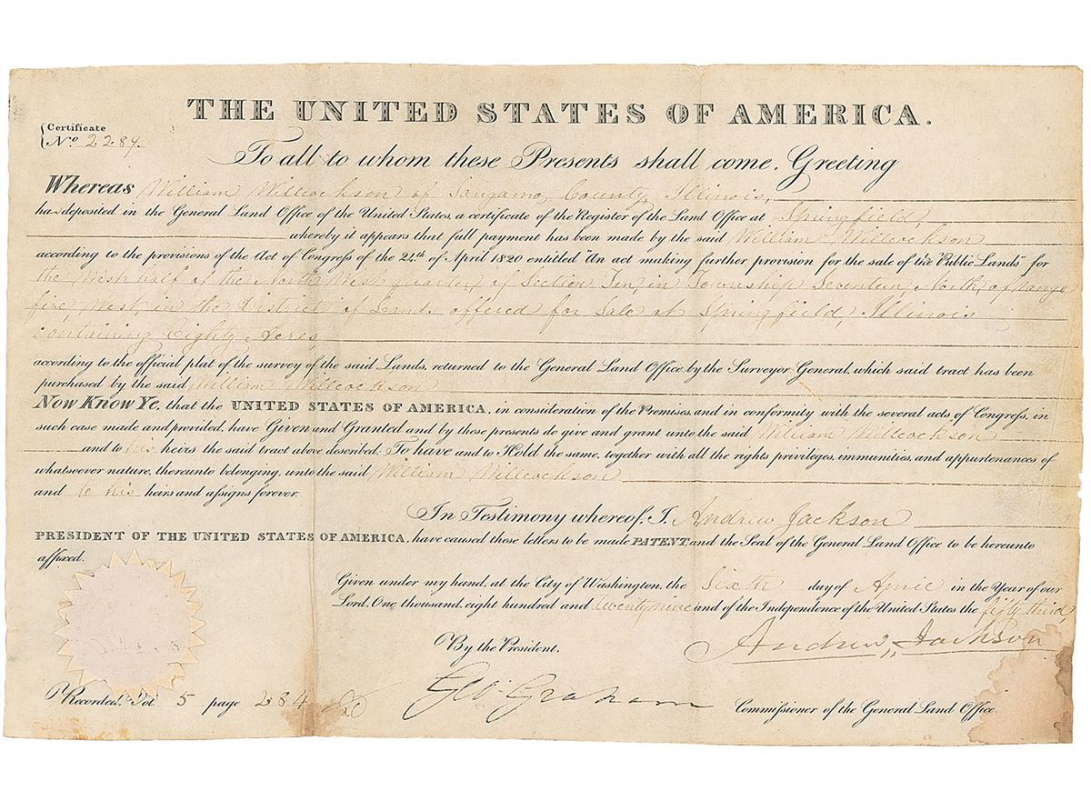 Partly-printed vellum DS as president, one page, 15.25 x 9.75, April 6, 1829. President Jackson grants William Willcockson of Sangamon County, Illinois, a parcel of land “at Springfield, Illinois, containing Eighty Acres.” Signed at the conclusion by President Jackson and countersigned by Commissioner of the General Land Office George Graham. The white paper seal affixed to the lower left remains clean and fully intact. Two vertical storage folds, a few small stains to the bottom (one affecting the last letter of Jackson’s signature), and overall writing slightly faded, otherwise fine condition.