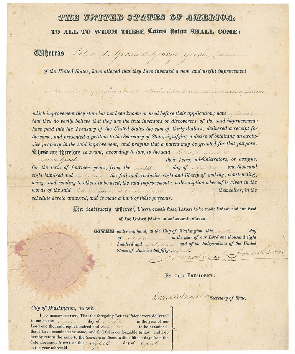 Partly-printed DS as president, one page, 10.75 x 13.25, April 8, 1833. Jackson issues a patent to Peter L. Grosh having “invented a new and useful improvement in the mode of applying wind to musical instruments by means of bellows.” Signed at the conclusion by Jackson and countersigned by Secretary of State Edward Livingston. Intersecting folds, one through a single letter of signature, scattered toning, handwritten portions and Jackson’s signature several shades light but still legible, marginal binding holes to left edge, and a lightly trimmed bottom edge, otherwise very good condition. The seal is toned, but intact, and missing its ribbons.
