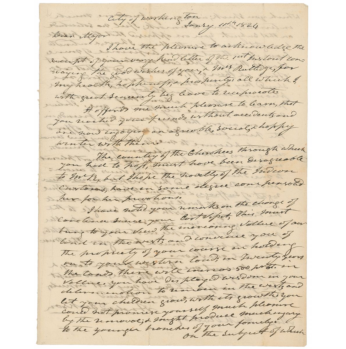 Exceptional ALS, one page both sides, 7.75 x 9.75, January 11, 1824. Lengthy letter to Major H. M. Rutledge, in which Jackson comments on Cherokee culture, speculates on the American West, and downplays his presidential ambitions. In part: “It offered me much pleasure to learn, that you reached your friends without accident…The country of the Cherokees through which you had to pass, must have been disagreeable to Mrs. R., but I hope the novelty of the Indian customs, have in some degree compensated her for her privations…