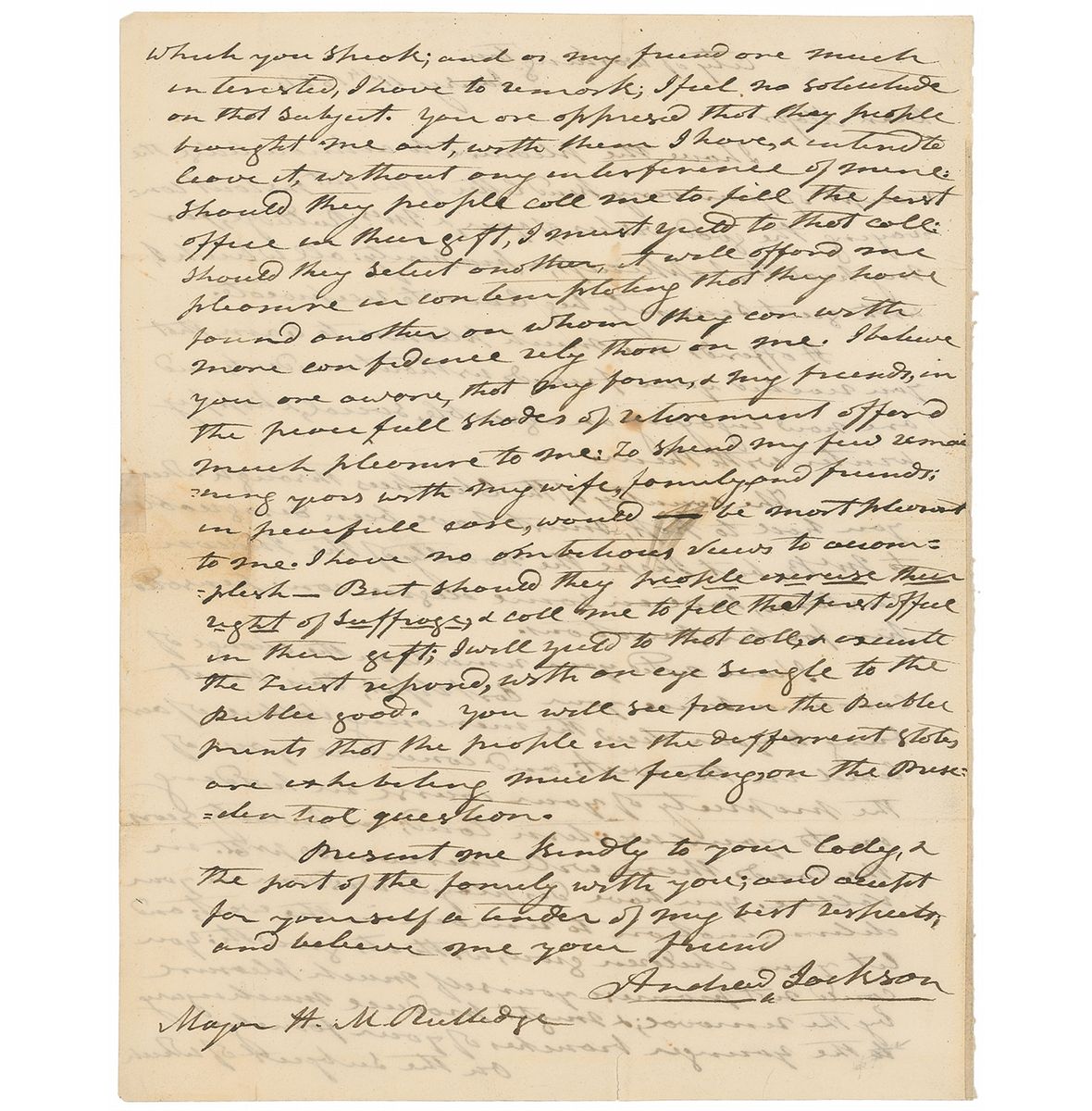On the subject of which you speak…Should they [sic] people call me to fill the first office in their gift, I must yield to that call: should they select another, it will afford me pleasure in contemplating that they have found another on whom they can rely on with more confidence than me…To spend my few remaining years with my wife, family and friends, in peace…would be most pleasant to me. I have no ambitious views to accomplish—But should they people exercise their right of suffrage, & call me to fill that first office in their gift; I will yield to that call, & execute the trust reposed, with an eye single to the public good. You will see from the public prints that the people in the different states are exhibiting much feeling, on the Presidential question.” In fine condition, with intersecting folds and show-through from writing to opposing sides.