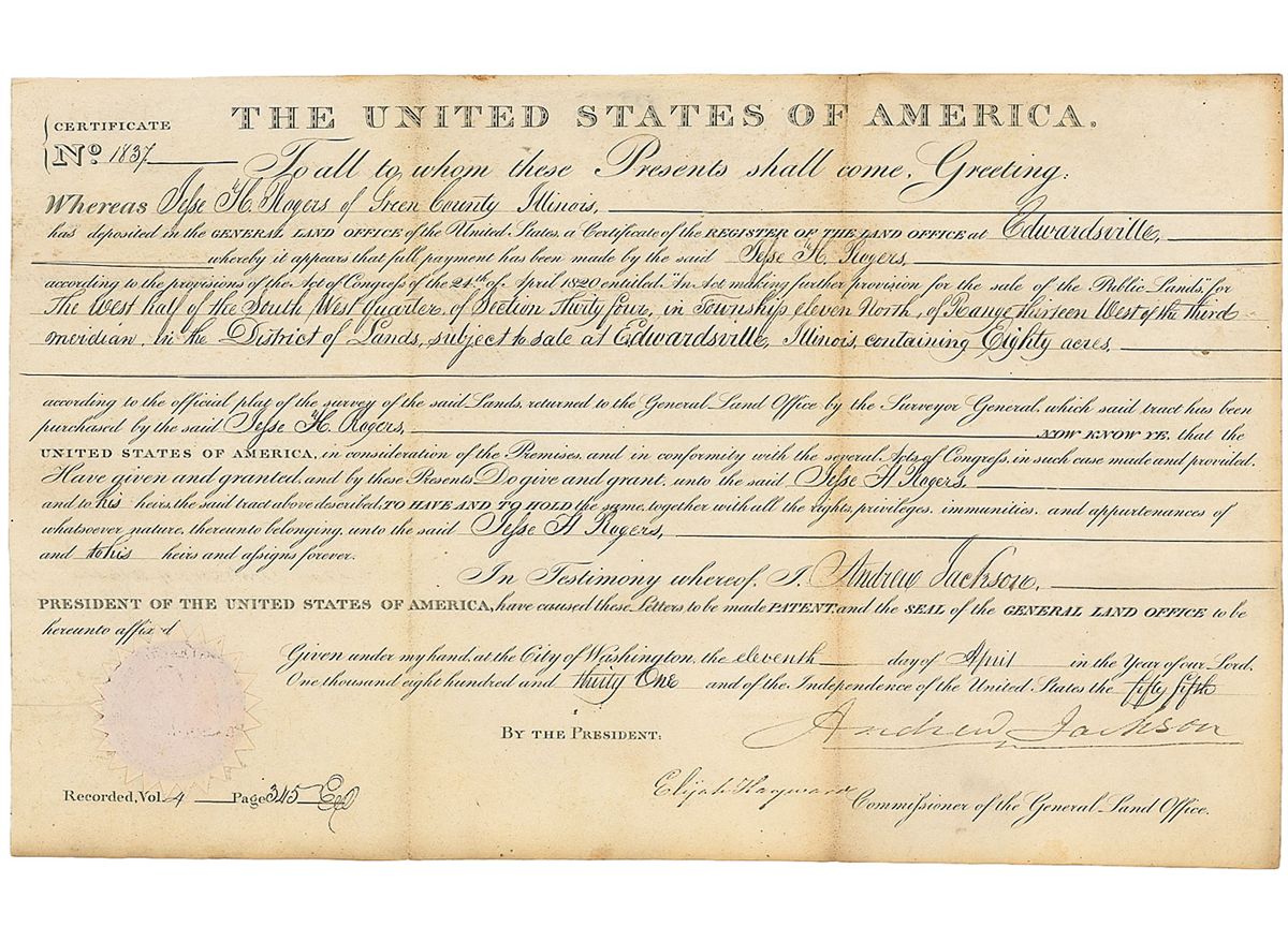 Partly-printed vellum DS as president, one page, 15.75 x 10, April 11, 1831. President Jackson grants Jesse H. Rogers a parcel of land “in the District of Lands, subject to sale at Edwardsville, Illinois, containing Eighty acres.” Crisply signed at the conclusion by President Jackson and countersigned by Commissioner of the General Land Office Elijah Hayward. The nicely embossed white paper seal affixed to the lower left remains fully intact. In fine condition, with a vertical storage fold passing through the first letter of his signature and toning to edges. A clean and boldly accomplished example.