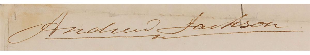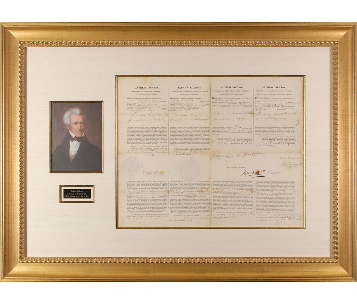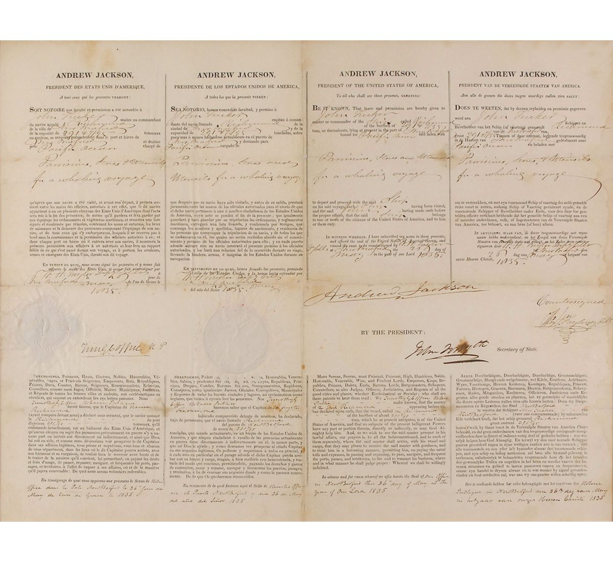 Partly-printed DS as president, one page, 20 x 16, May 26, 1835. Four-language ship’s papers issued to “John Tucker, master or commander of the Ship called Richmond…lying at present in the port of New Bedford bound for Pacific Ocean and laden with provisions stores and utensils for a whaling voyage.” Boldly signed in the middle by Jackson and countersigned by Secretary of State John Forsyth. Document retains two white paper seals affixed in the center. Beautifully cloth-matted and framed with a portrait and nameplate to an overall size of 38.5 x 27. In very good condition, with partial separations to intersecting folds (horizontal fold passing through the top of the signature) and scattered staining. Oversized.