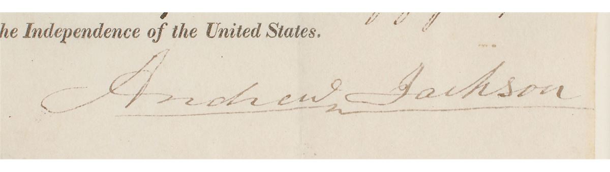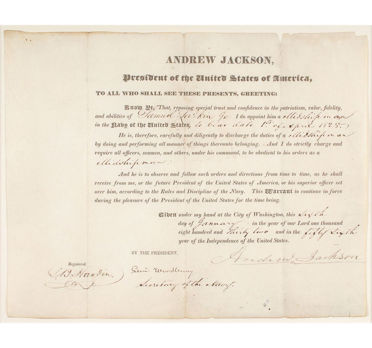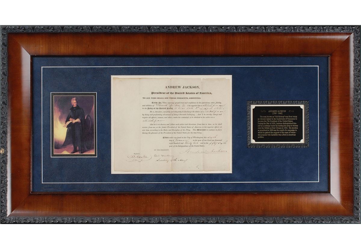 Partly-printed DS as president, one page, 11.25 x 9, January 6, 1832. President Jackson appoints Samuel Larkin, Jr., as “a Midshipman in the Navy of the United States.” Crisply signed at the conclusion by Jackson and countersigned by Secretary of the Navy Levi Woodbury. Suede-matted and framed with a portrait and a biographical plaque to an overall size of 35.75 x 19.5. Three vertical folds (one passing through a single letter of the signature), some chipping to edges, a few edge chips, and light soiling, otherwise fine condition. A seldom-seen format in the era of America’s scaled-back naval forces following the War of 1812. Oversized.