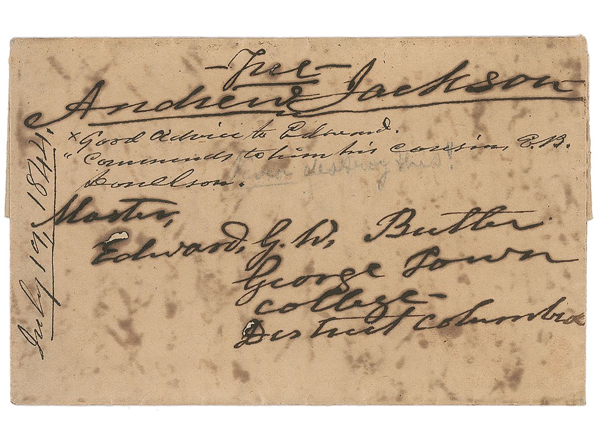 Full hand-addressed free frank, measuring 10 x 8 unfolded, with panel measuring 5 x 3.25, addressed in Jackson’s hand to “Master Edward G. W. Butler, George Town College, District Columbia,” and boldly franked along the top of the panel, “Free, Andrew Jackson.” Panel is also docketed by the recipient and dated July 17, 1844. In very good condition, with missing top left corner, partial separations to folds (none affecting panel or signature), scattered toning, and some show-through from transfer of ink from text. Jackson’s signature extends across the entire panel and measures an impressive 4.75? long.