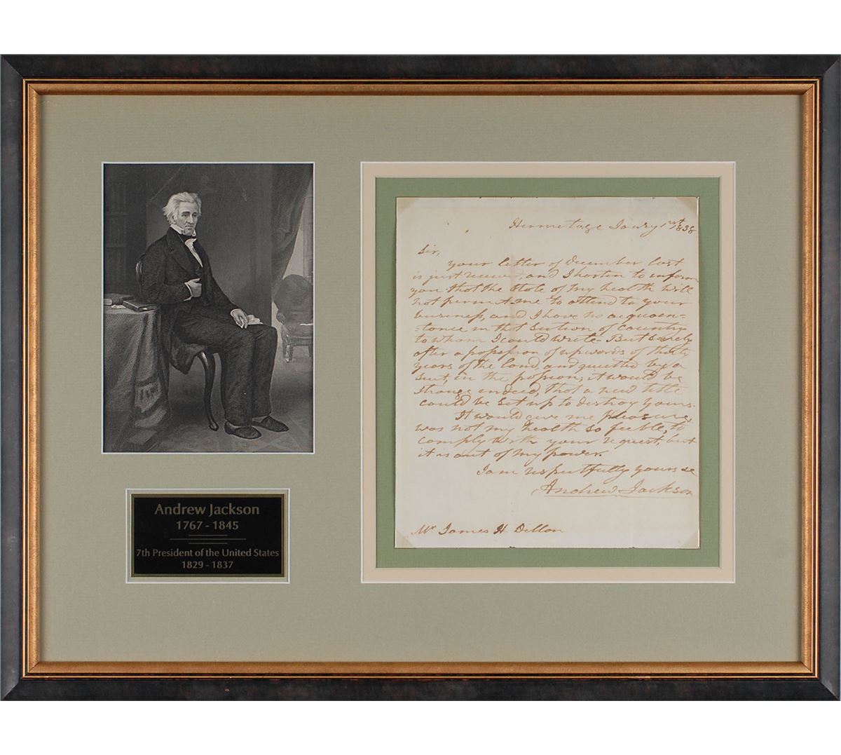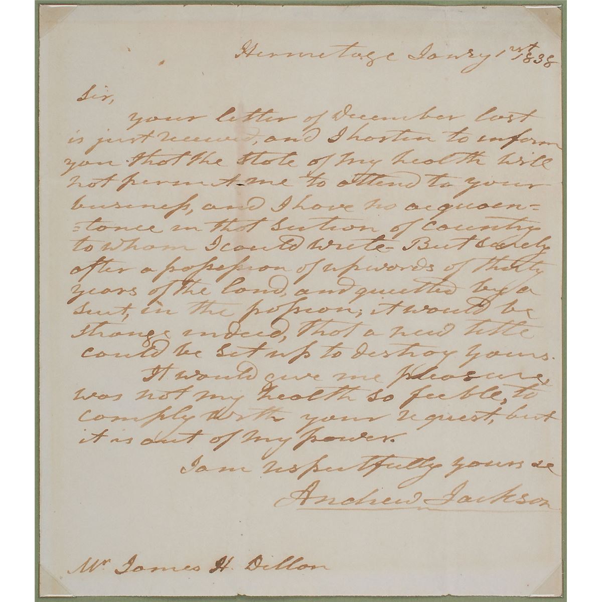 ALS, one page, 7.5 x 8.25, January 1, 1838. Letter to James H. Dillon concerning the possibility of a challenge to Dillon's title on his property. In part: “I hasten to inform you that the state of my health will not permit me to attend to your business, and I have no acquaintance in that Section of country to whom I could write. But surely after a possession of upwards of thirty years of the land, and quieted by a suit…it would be strange indeed, that a new title could be set up to destroy yours. It would give me pleasure was not my health so feeble, to comply with your request, but it is out of my power.” Nicely double-matted and framed with a plaque and engraved portrait to an overall size of 20.5 x 15.5. In fine condition, with intersecting folds (one vertical fold passing through a single letter of the signature), a mild overall block of toning, and a thin vertical stain passing through the first several lines of the letter.