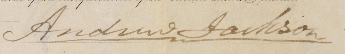 Partly-printed vellum DS as president, three pages two sheets, 11.5 x 15, April 3, 1835. A patent issued to “Elisha Holton, a citizen of the State of Pennsylvania in the United States, [who] hath alleged that he has invented a new and useful improvement in the construction of a grist mill.” Nicely signed at the conclusion by President Jackson and countersigned by Secretary of State John Forsythe and Attorney General Benjamin F. Butler. The document retains its embossed white paper seal and ribbons. The second page, still attached with its original pink ribbon, contains a detailed description of the patent signed by Holton; also inserted is a hand-drawn and colored diagram of his grist mill. In very good condition, with heavy intersecting folds (one vertical fold passing through a single letter of the signature), moderate scattered soiling, and most writing a bit faded (except for Jackson’s bold signature). An uncommon and highly desirable format.