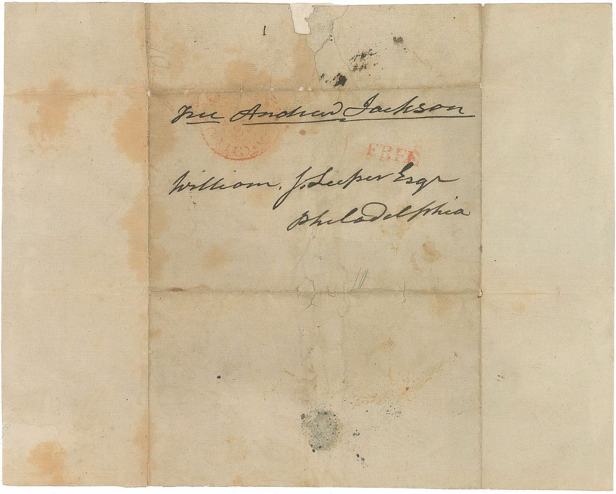 Uncommon full free frank as president, measuring 10 x 8 unfolded with a center panel of 5.25 x 3.25, boldly addressed by Jackson to “William J. Leiper Esqr, Philadelphia,” and franked along the top, “Free, Andrew Jackson.” Expertly silked on both sides for reinforcement and preservation. In very good condition. Accompanied by a color photocopy of the letter originally sent under this cover.