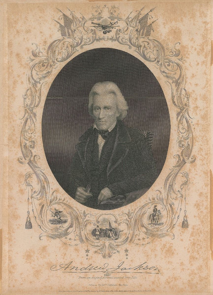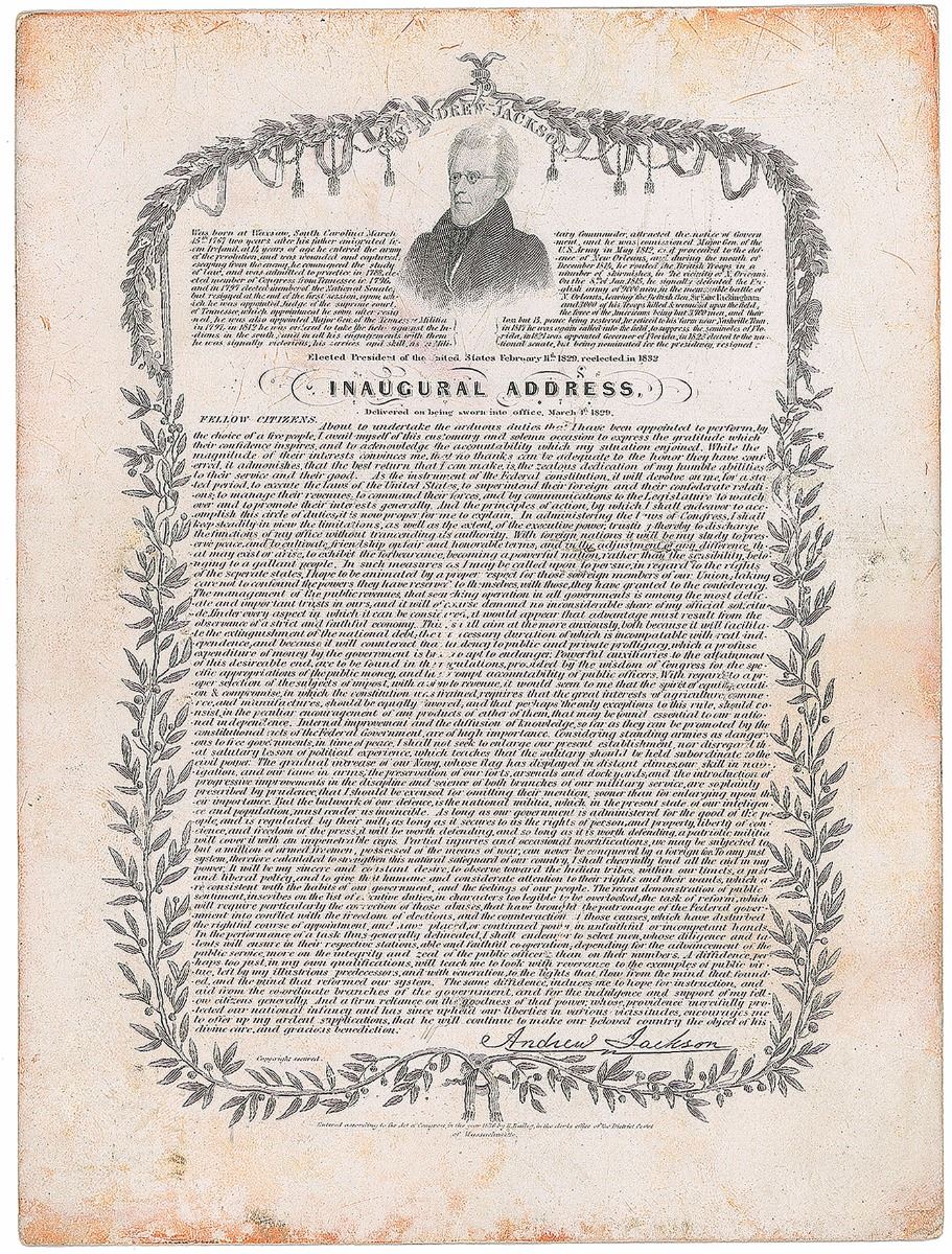 Three unsigned items: a 4.25 x 6.5 cabinet photo of Jackson by Hoyt/Brady’s National Gallery; a 5 x 6.5 engraving of Jackson’s inaugural address printed in 1836 to commemorate his retirement; and a 7.75 x 10.75 engraved portrait bearing a facsimile signature, printed by Johnson, Fry & Co. in 1857. In overall good to very good condition, with scattered foxing and staining.
