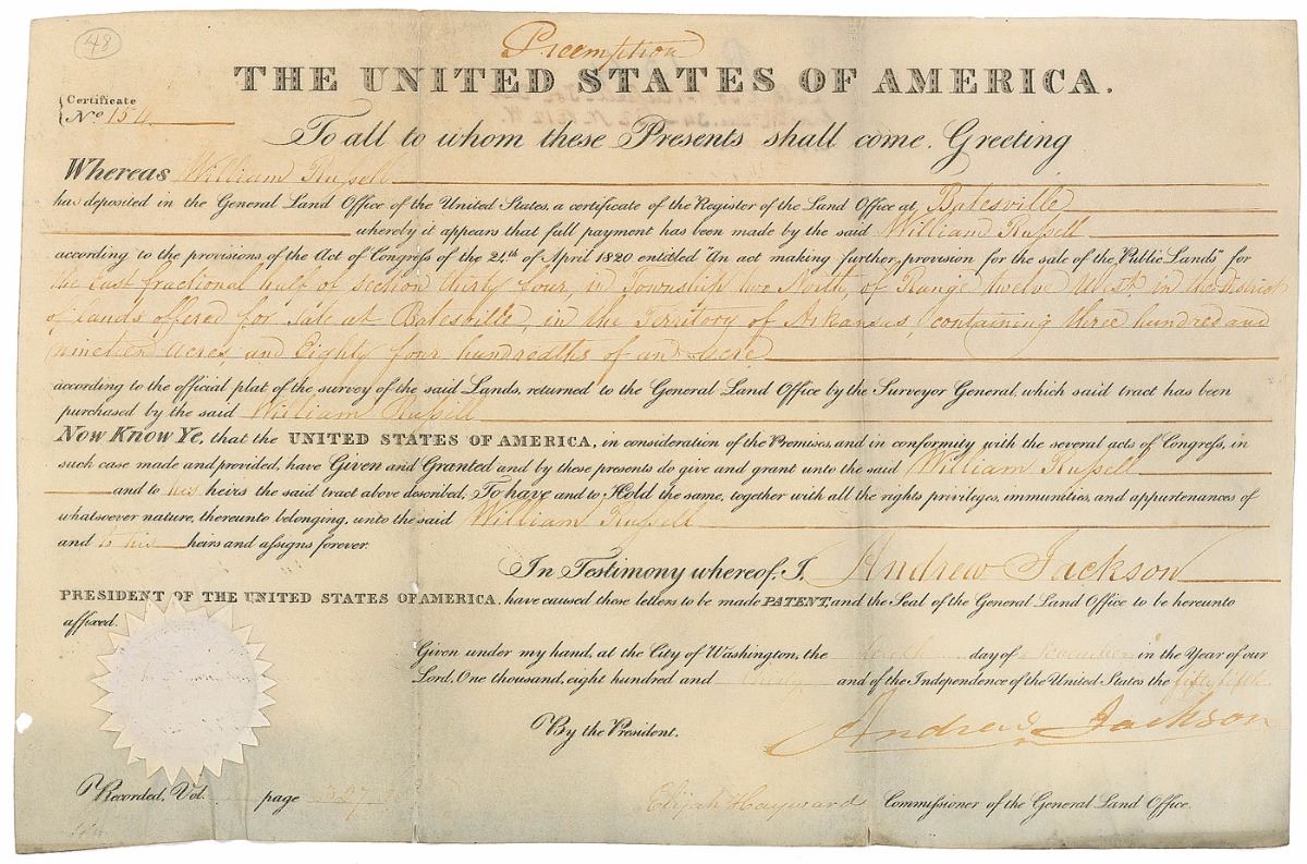 Partly-printed vellum DS as president, one page, 15.5 x 10, December 10, 1830. President Jackson grants William Russell a parcel of land “at Batesville, in the Territory of Arkansas, containing three hundred and nineteen acres.” Signed at the conclusion by President Jackson and countersigned by Commissioner of the General Land Office Elijah Hayward. The white paper seal affixed to the lower left remains intact with one missing point. In fine condition, with a small hole to left edge.