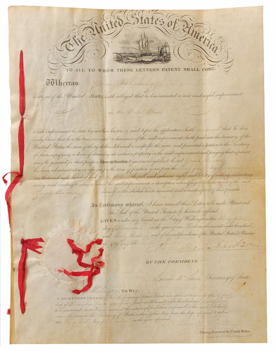 Partly-printed vellum DS as president, two pages, 11.5 x 14.75, December 31, 1833. Patent issued to “Zerah Blakely, a citizen of the United States, [who] hath alleged that he has invented a new and useful improvement in the Water Wheel.” Signed at the conclusion by President Jackson, and countersigned by Secretary of State Louis McLane and Attorney General Benjamin F. Butler. The seal and ribbon affixed to the left edge remain intact with a split to the ribbon, and it retains the second page with a description of the invention. In very good condition, with intersecting folds and scattered toning.