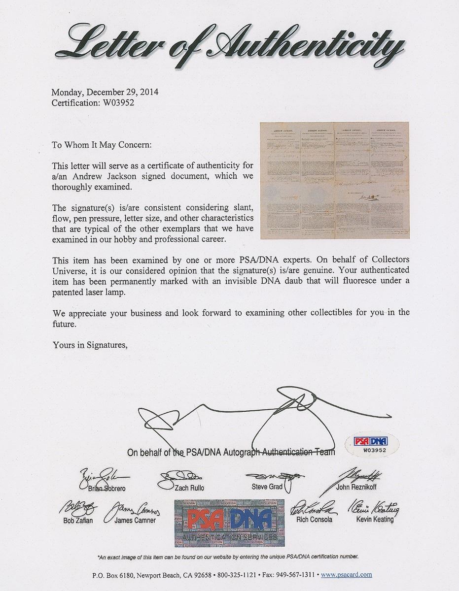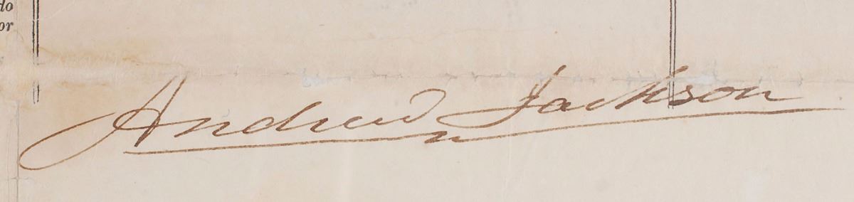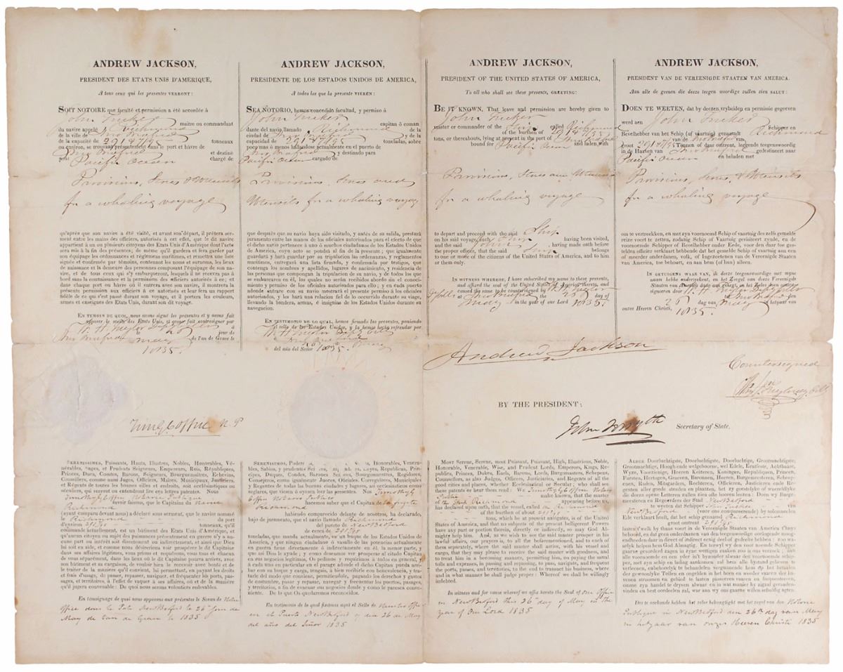 Partly-printed DS as president, one page, 20.25 x 16.25, May 26, 1835. Four-language ship’s paper issued to “John Tucker master or commander of the Ship called Richmond…lying at present in the port of New Bedford bound for Pacific Ocean and laden with Provisions, Stores, and Utensils for a whaling voyage.” Signed in the center by President Jackson and countersigned by Secretary of State John Forsyth. The white paper seals affixed to the left side remain intact. Removably encapsulated in a Mylar sleeve. Restored to very good condition, with repaired separations to intersecting folds (including a horizontal separation affecting the top of the signature), scattered foxing, and dampstaining to edges. Accompanied by a full letter of authenticity from PSA/DNA.