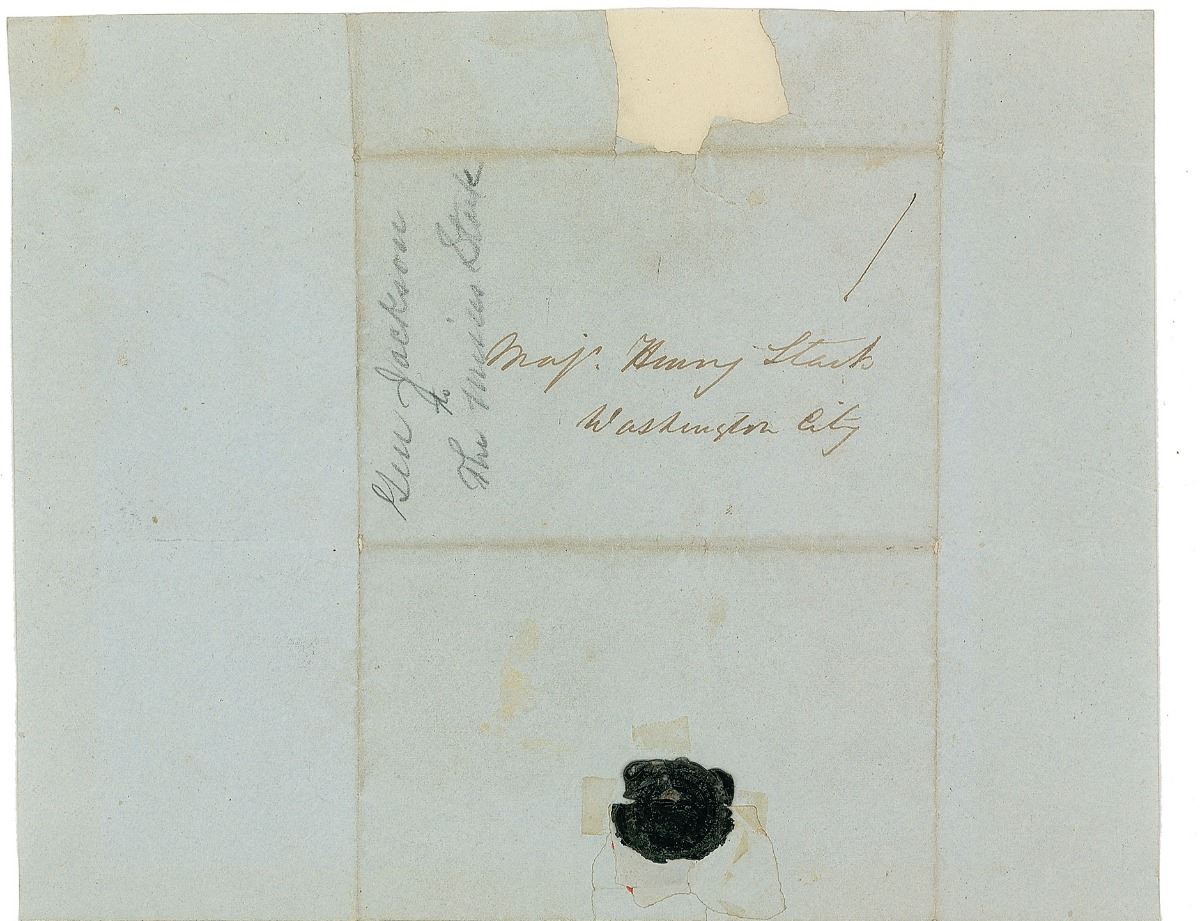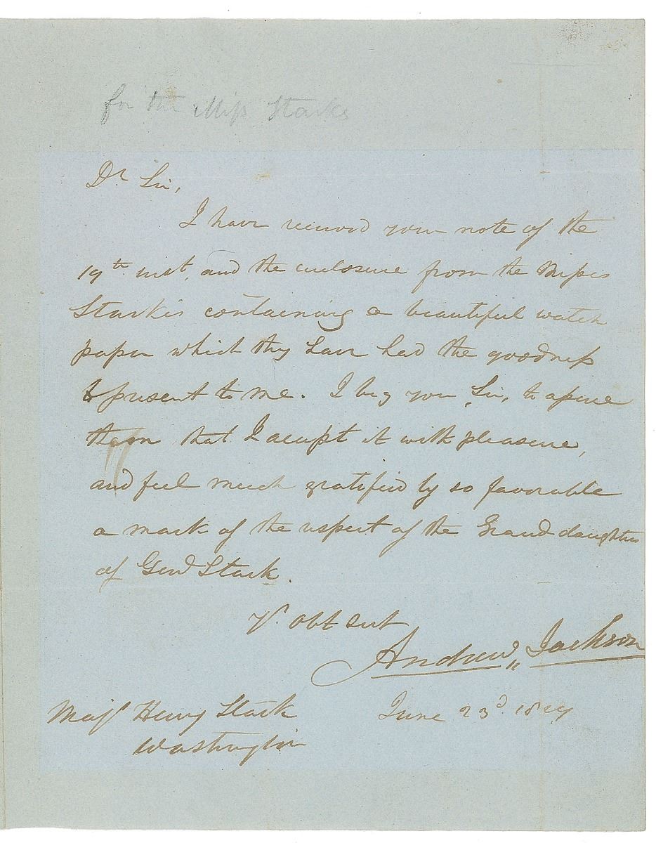 ALS as president, one page, 8 x 10, June 23, 1829. Letter to Major Henry Stark, son of the late General John Stark, sent to thank his daughters for a gift. In full: “I have received your note of the 19th inst. and the enclosure from the Misses Starks containing a beautiful watch paper which they have had the goodness to present to me. I beg you, Sir, to assure them that I accept it with pleasure, and feel much gratified by so favorable a mark of the respect of the Granddaughters of Genl. Stark.” Addressed on the reverse of the second integral page in his own hand. Professionally silked on the reverse and in fine condition, with smoothed intersecting folds, mild toning to borders, a trivial brush to ink in one word, and repaired paper loss from seal removal to second integral page. Accompanied by the original address panel that contained the watch paper, a hand-colored engraving of the Battle of New Orleans, and a portrait of Jackson. John Stark was a major general in the Continental Army who became known as the ‘Hero of Bennington’ for leading the decisive American victory at the Battle of Bennington in 1777. A scarce handwritten letter as president and a fine association between early American military heroes.