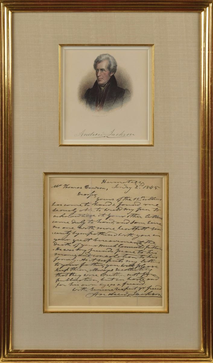 ALS, one page, 7.5 x 8.25, January 2, 1845. Letter to Thomas Dawson, expressing his condolences over the loss of his father, Moses Dawson, in full: "Yours of the 19th ultimo has come to hand & found me scarcely able to wield my pen to acknowledge it. Your other letters come duly to hand, and I am sure no one with more heartfelt sincerity sympathized with you in your great bereavement the death of your much lamented father. He was my friend, peace be to his name and consolation to his family. As it respects my letters to your father, you will please keep them, allways recollecting that they were written not for publication, but in haste and for his eye, as a friend." Cloth-matted and framed with an engraving bearing a facsimile signature to an overall size of 14 x 23.5. In very good to fine condition; while the letter has not been examined out of the frame, it appears to be completely professionally silked.