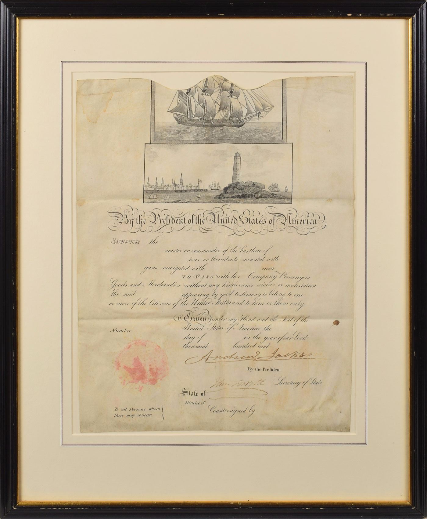 Partly-printed vellum DS as president, one page, 11.5 x 15, no date. Unissued scallop-topped ship’s pass, signed at the bottom by Jackson, and countersigned by Secretary of State John Forsyth. The red paper seal has been removed. Matted and framed to an overall size of 18 x 22, with the reverse of frame bearing an affixed Goodspeed’s Book Shop label. In very good to fine condition, with some light staining, the wafer seal absent, and the end of Jackson's signature partially missing.