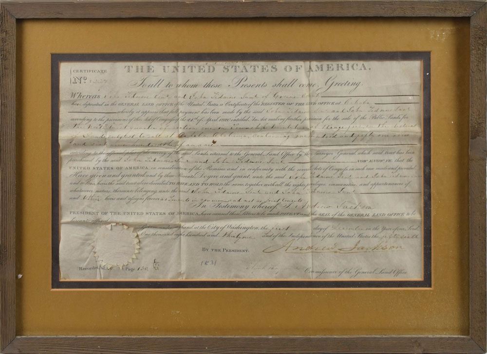 Partly-printed vellum DS as president, one page, 15.25 x 9.25, December 1, 1831. President Jackson grants John Tidmore, Sr., and John Tidmore, Jr., of Greene County, Alabama, a tract of land "subject to sale at Cahaba, Alabama, containing one hundred and fifty one acres and sixty nine hundredths of an acre." Prominently signed at the conclusion by President Jackson and countersigned by Commissioner of the General Land Office Elijah Hayward. Lower left bears the original white seal. Double-matted and framed to an overall size of 20.5 x 15. In very good condition, with heavy intersecting folds.
