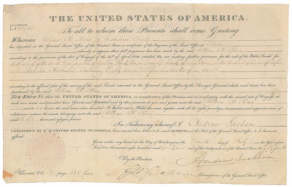 Partly-printed vellum DS as president, one page, 15.5 x 9.75, July 7, 1829. President Jackson grants William M. Marr a tract of land in "Cahaba, Alabama, containing Eighty acres, and four hundredths of an acre." Prominently signed at the conclusion by President Jackson and countersigned by Commissioner of the General Land Office George Graham. The white paper seal affixed to the lower left remains intact. In fine condition, with a small stain to the lower left corner.