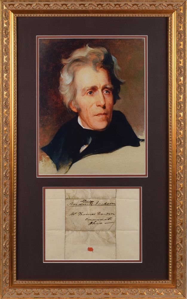 Full free frank, measuring 9.25 x 7 unfolded with a center panel of 5 x 3.25, boldly addressed in Jackson’s hand to “W, Thomas Dawson, Cincinnati, Ohio,” and signed across the top, “Free Andrew Jackson.” Double-matted and framed with a large portrait of Jackson to an overall size of 18.5 x 29.5. In very good condition, with a tear working down from the top edge, and scattered heavy creases and moderate soiling; the signature and handwriting remain extremely bold.