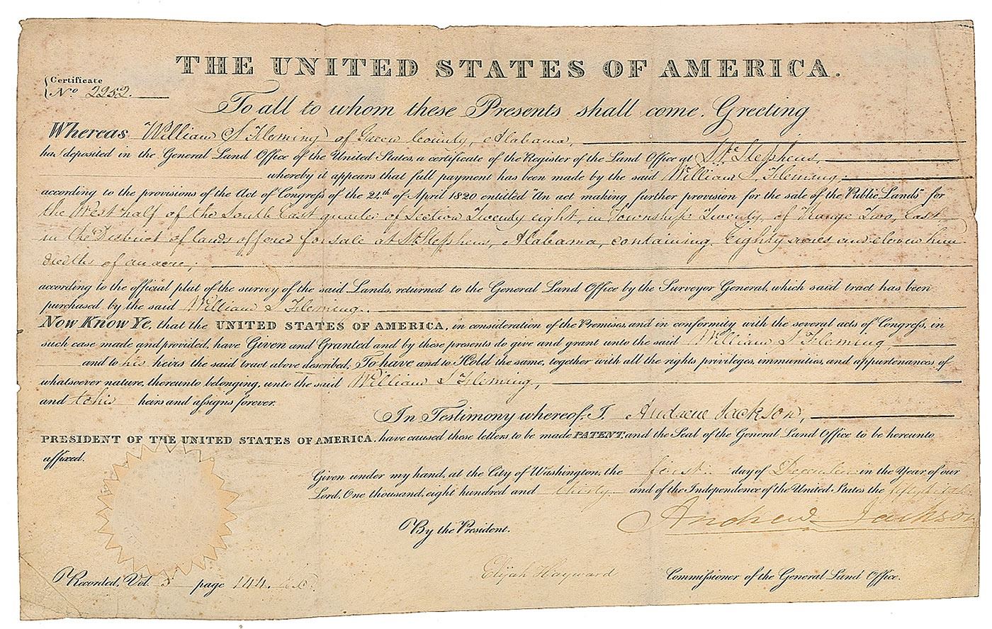 Partly-printed vellum DS as president, one page, 15.75 x 9.5, December 1, 1830. President Jackson grants William S. Fleming a tract of land in "St. Stephens, Alabama, containing Eighty acres and eleven hundredths of an acre." Prominently signed at the conclusion by President Jackson and countersigned by Commissioner of the General Land Office Elijah Hayward. The white paper seal affixed to the lower left remains intact. In very good condition, with scattered light foxing, pinholes of paper loss, and the signature light but legible.