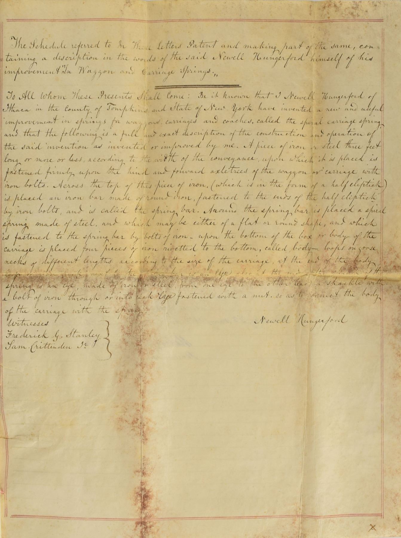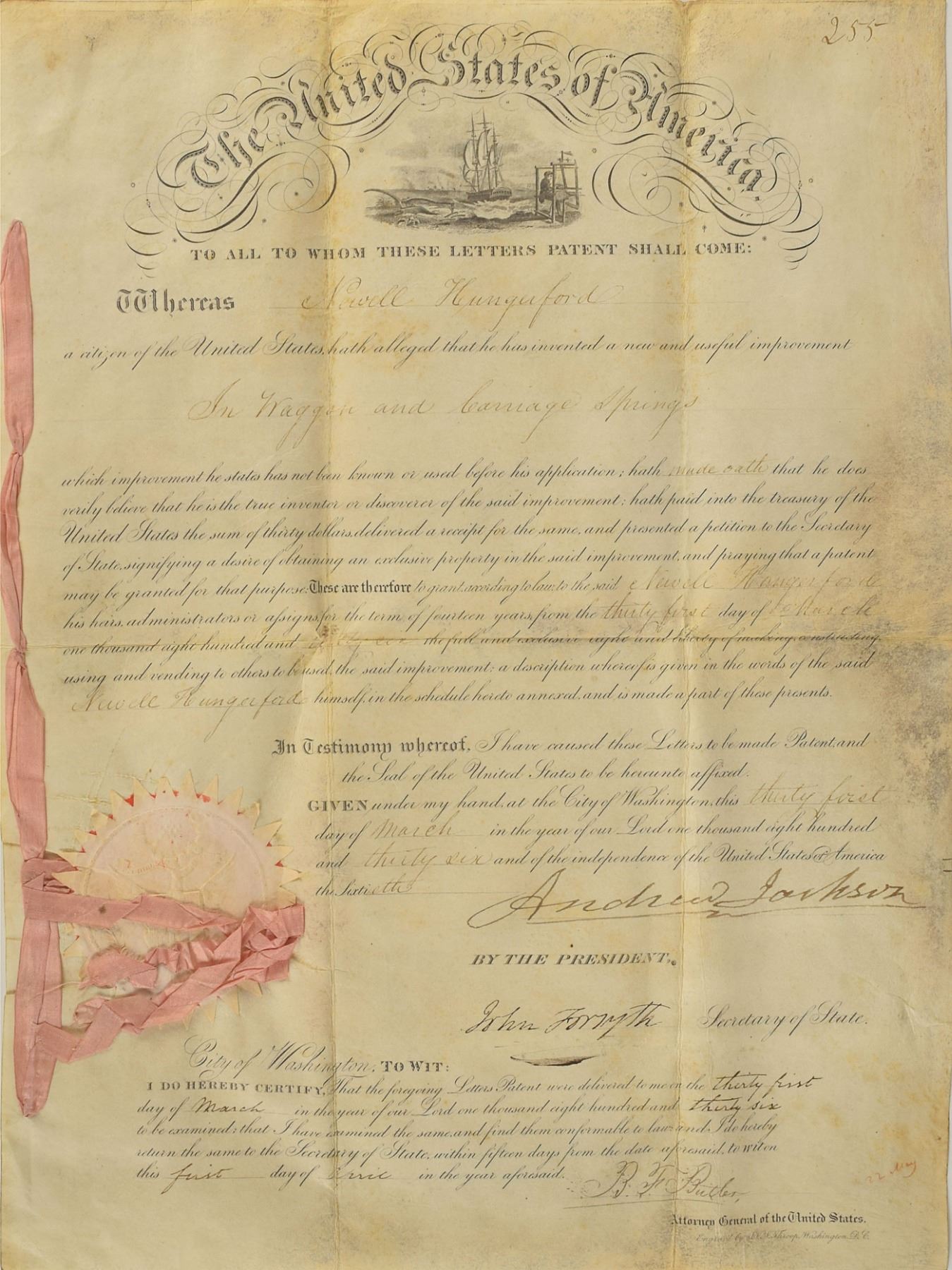 Partly-printed vellum DS as president, two pages, 11.5 x 15.25, March 31, 1836. Patent issued to "Newell Hungerford, a citizen of the United States, [who] hath alleged that he has invented a new and useful improvement In Waggon and Carriage Spring." Boldly signed at the conclusion by President Jackson, and countersigned by Secretary of State John Forsyth and Attorney General Benjamin F. Butler. The white paper seal and pink ribbon remain intact on the left side, and the document retains its second page bearing a description of the invention. In very good condition, with toning, staining, and heavy intersecting folds. Accompanied by an unsigned matte-finish photo.
