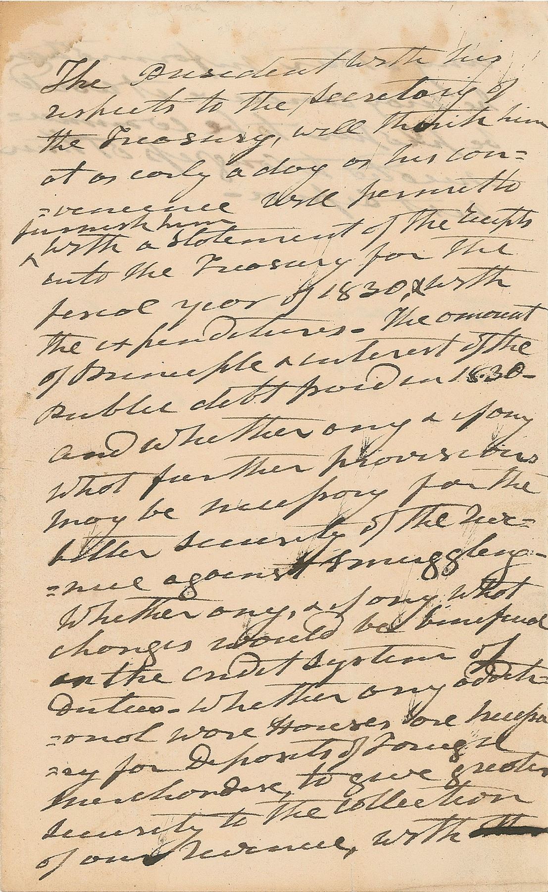 Third-person ALS as president, signed within the text, "The President," one page both sides, 5 x 8, no date but circa early 1831. Letter addressed to "Secretary of the Treasury," Samuel D. Ingham, in full: “The President with his respects to the Secretary of the Treasury, will thank him at as early a day or his convenience will permit to furnish him with a statement of the receipts into the Treasury for the fiscal year of 1830, & with the expenditures. The amount of principle & interest of the Public debt paid in 1830—and whether any & if any what further provisions may be necessary for the better security of the revenue against smuggling—whether any, & if any, what changes would be beneficial on the credit system of duties—whether any additional ware Houses are necessary for Deposits of Foreign merchandise, to give greater security to the collection of our revenue, with any other information he may conceive it would be proper to be communicated to Congress at their next session.” In fine condition, with some light staining.