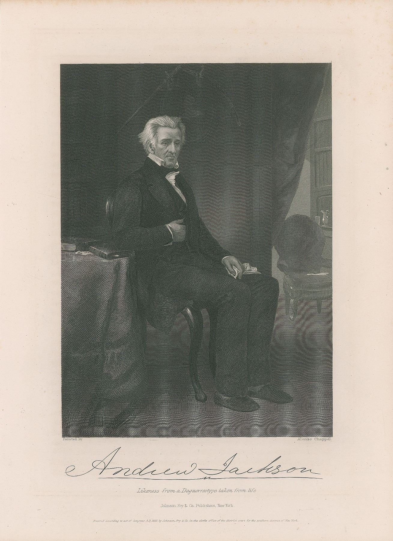 Partly-printed vellum DS as president, one page, 15.75 x 9.75, January 1, 1831. President Jackson grants James Poodwine a parcel of land "at Crawfordsville, Indiana, containing Eighty Acres." Prominently signed at the conclusion by President Jackson and countersigned by Commissioner of the General Land Office Elijah Hayward. The crisp white paper seal affixed to the lower left remains fully intact. In fine condition. An uncommonly well-preserved example. Accompanied by an engraved portrait bearing a facsimile signature.