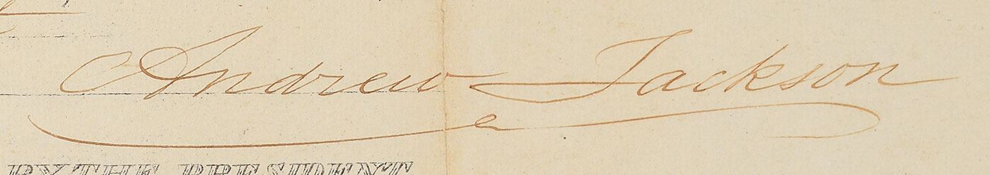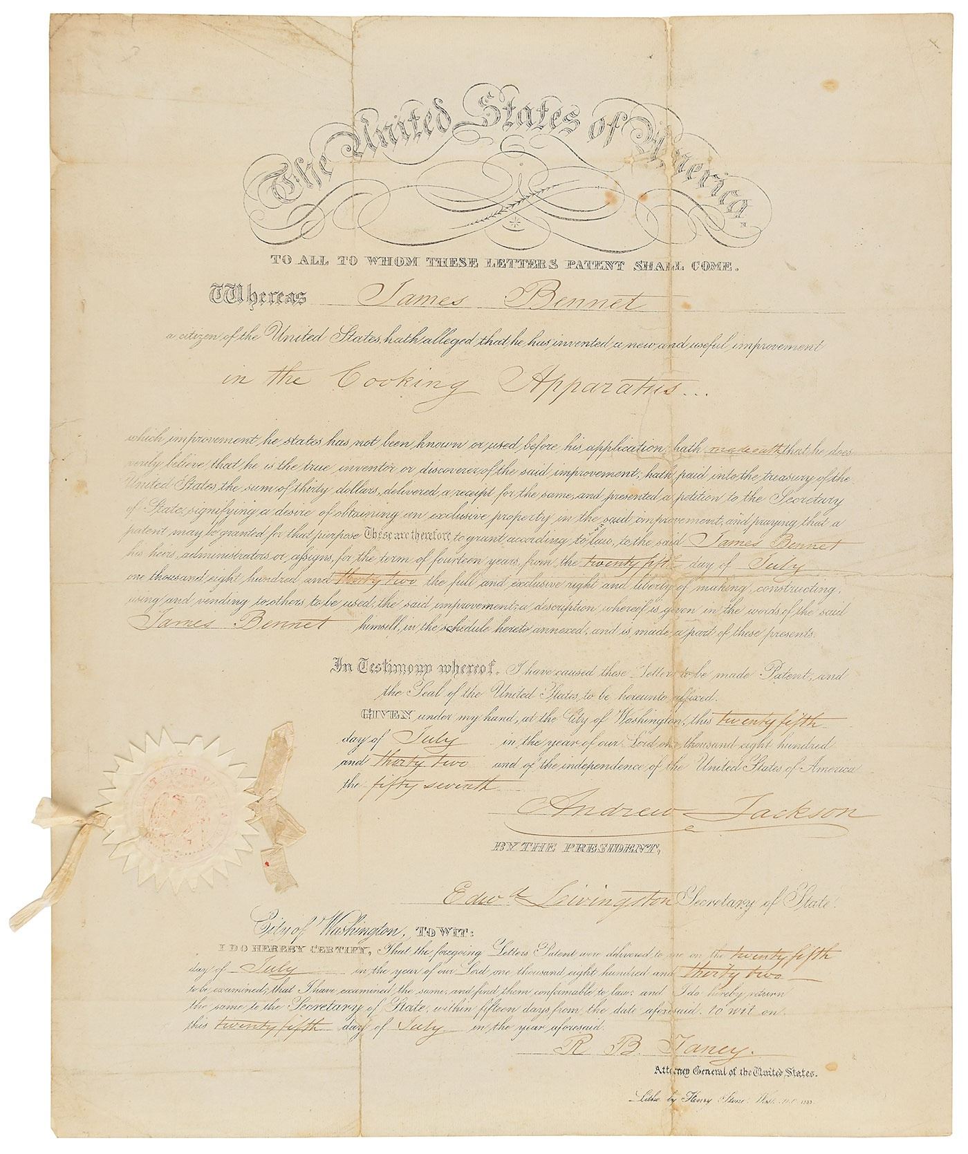Partly-printed DS as president, one page, 13 x 16.25, July 25, 1832. Patent issued to "James Bennett, a citizen of the United States, [who] hath alleged that he has invented a new and useful improvement in the Cooking Apparatus." Prominently signed at the conclusion by President Jackson, and countersigned by Secretary of State Edward Livingston and Attorney General Roger B. Taney. The white paper seal and ribbon affixed to the lower left remains intact. In very good to fine condition, with minor paper loss along the intersecting folds, and complete professional backing for reinforcement.