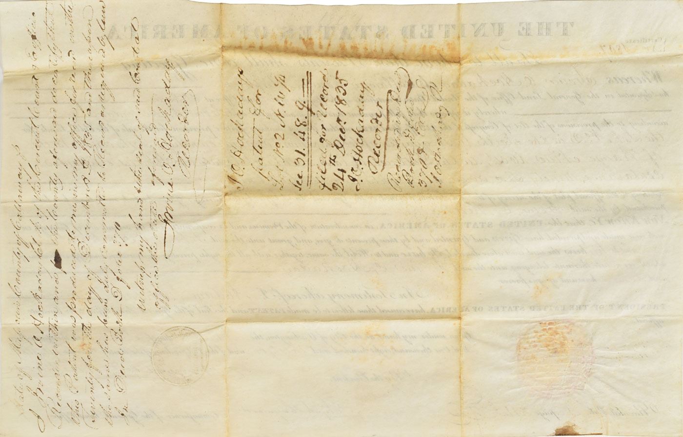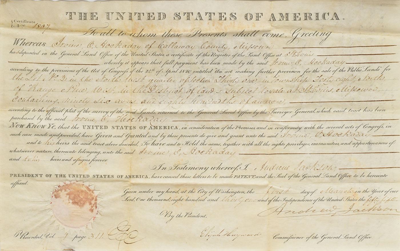 Partly-printed vellum DS as president, one page, 15.5 x 9.5, March 1, 1831. President Jackson grants Irvine O. Hockaday of Callaway County, Missouri, a parcel of land "at St. Louis, Missouri, containing ninety six and eighty hundredths of an acre." Beautifully signed at the conclusion by Jackson and countersigned by Commissioner of the General Land Office Elijah Hayward. The white paper seal affixed to the lower left is stained but intact. The reverse is lengthily endorsed by Hockaday as recorder for Callaway County. In very good to fine condition, with light toning to the top, and staining to the intact seal. Hockaday was Callaway County’s first clerk and later became president of the Fulton branch of the Western Bank of St. Joseph; in 1862, he intervened on behalf of a wealthy Callaway County farmer whose lands had been seized by federal authorities after the farmer participated in attacks on the North Missouri Railroad. Hockaday was also an early settler of Missouri and a friend of Daniel Boone's grandson, Alphonso Boone. An interesting association piece bearing a large, crisp presidential signature.