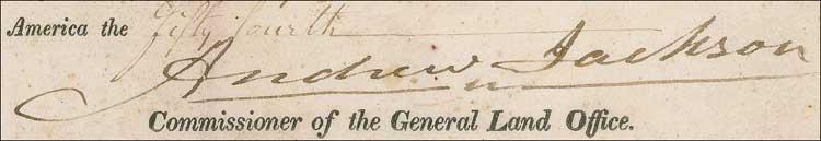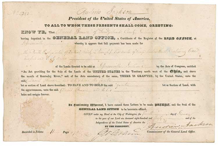 Vellum DS as president, one page, 14 x 9, January 4, 1830. Jackson grants David Runner 160 acres of land in Jeffersonville, Indiana. Signed at the conclusion by Jackson and countersigned by the Commissioner of the General Land Grant Office, George Graham. In very good condition, with two lightly toned vertical folds (one lightly affecting the first letter of the signature), scattered light soiling, toning, and wrinkling. The white seal is worn, but intact and Jackson’s signature is quite bold. Pre-certified John Reznikoff/PSA/DNA and RRAuction COA.