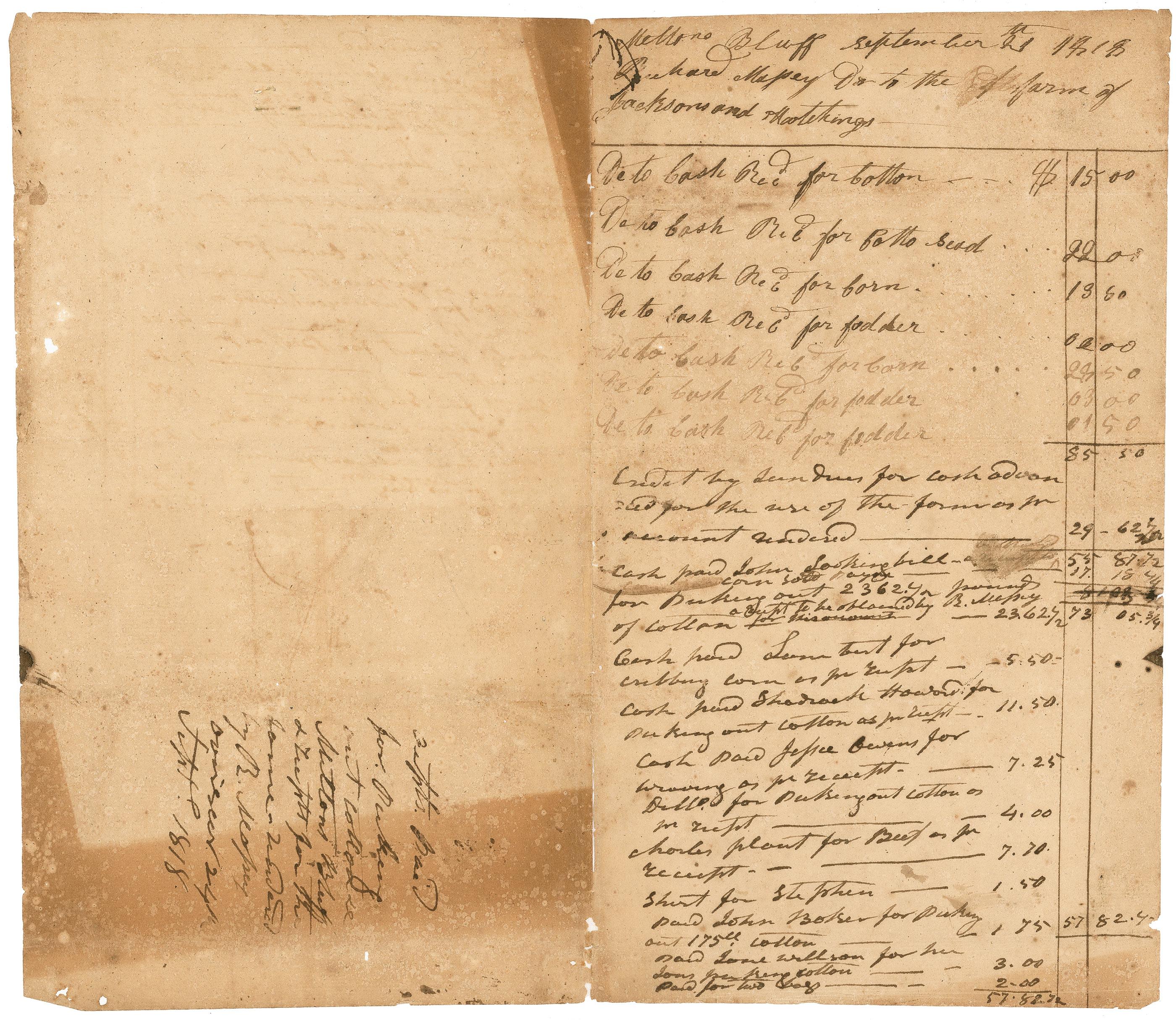 Unsigned autograph document, 10.25 x 7, dated September 21, 1818. Headed in another hand, “Meltons Bluff September 21st 1818 Richard Massey Dr to the farm of Jacksons and Hutchings.” Richard Massey was the overseer of the plantation. The first seven entries, for “Cotton…Corn…fodder…” totaling $85.50 are also not in Jackson’s hand, but the next 20 lines, over 100 words and amounts, were penned by Andrew Jackson. In part, “Credit by Sundries for cash advanced for the use of the farmers for account rendered $29.62½” which is deducted by Jackson from the $85.50 leaving a balance of $55.87½. Continuing, “cash paid John Lookingbill for picking out 2362½ pounds of cotton a receipt to be obtained by R. Massey…cash paid Sambert for cutting corn as pr recpt 5.50…cash paid Shadrack Howard for picking out cotton as pr recpt 11.50…Cash paid Jessie Owens for weaving as pr receipt. 7.25 Ditto for Picking out cotton as pr recpt 4.00…Charles Plant for Beef as pr receipt 7.70…Shirt for Stephen…paid John Baker for picking out 175 lb cotton…paid Jane Willson for her sons picking cotton…” Docketed by Jackson on the reverse of the integral leaf: “repts paid for Picking out cotton &c Meltons Bluff & recpts for the same – rendered by R. Massey overseer 24th Septr 1818.” Accompanied by five manuscript receipts mentioned by Jackson in the above document. Professional repair to central vertical separation between the sheet and its integral leaf, some scattered pinholes of paper loss, scattered toning and soiling, and some chipping to edges, otherwise very good condition. Pre-certified John Reznikoff/PSA/DNA and RRAuction COA.