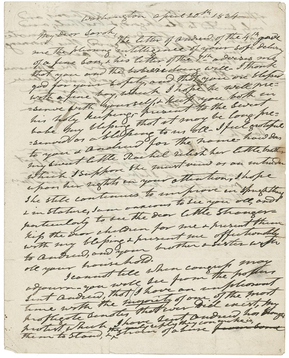 ALS as president, one page both sides, 8 x 9.75, April 20, 1834. Letter to his daughter-in-law Sarah Jackson. In full: “The letter of Andrew of the 4th gave me the pleasing intelligence of your safe delivery of a fine son, & his letter of the 7th advises me that you and the babe are doing well. I thank God for your safety, and that you are blessed with a fine boy, which I hope he will preserve with yourself, & keep you both in his holy keeping, –present to the sweet babe my blessing that it may be long preserved as a blessing to us all. I feel grateful to you & Andrew for the name–how does my sweet little Rachel relish her little brother which I suppose she must view as an intruder upon her rights in your attention. I hope she still continues to improve in sprightliness and in stature, I am anxious to see you all, and particularly to see the dear little stranger–kiss the dear children for me & present them with my blessing & present me affectionately to Andrew, and your brother & sister with all your household.