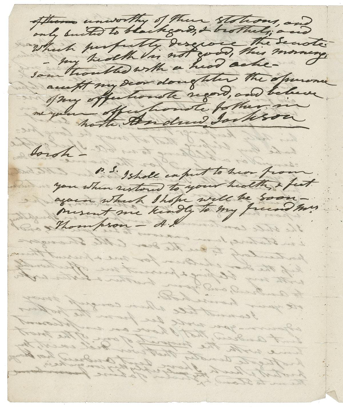 Under his signature, Jackson pens a postscript, which reads: “Sarah–P.S. I shall expect to hear from you when restored to your health, & feet again which I hope will be soon– present me kindly to my friend Mrs. Thompson–A.J.”