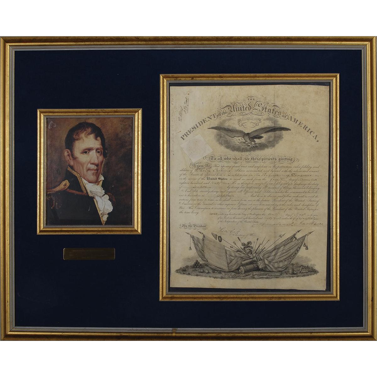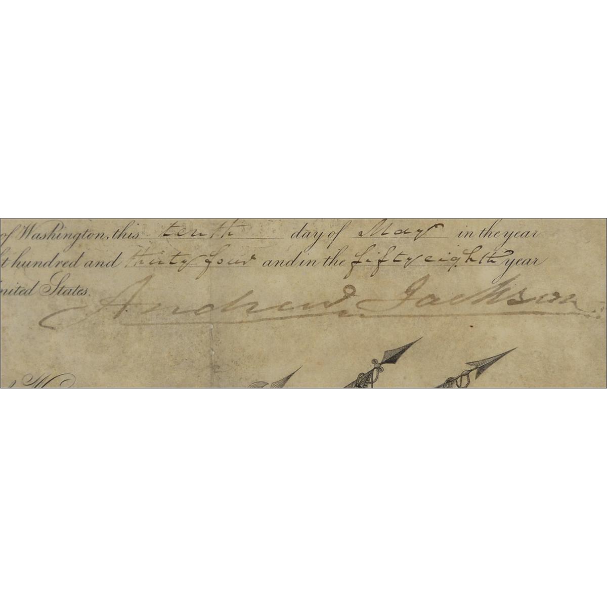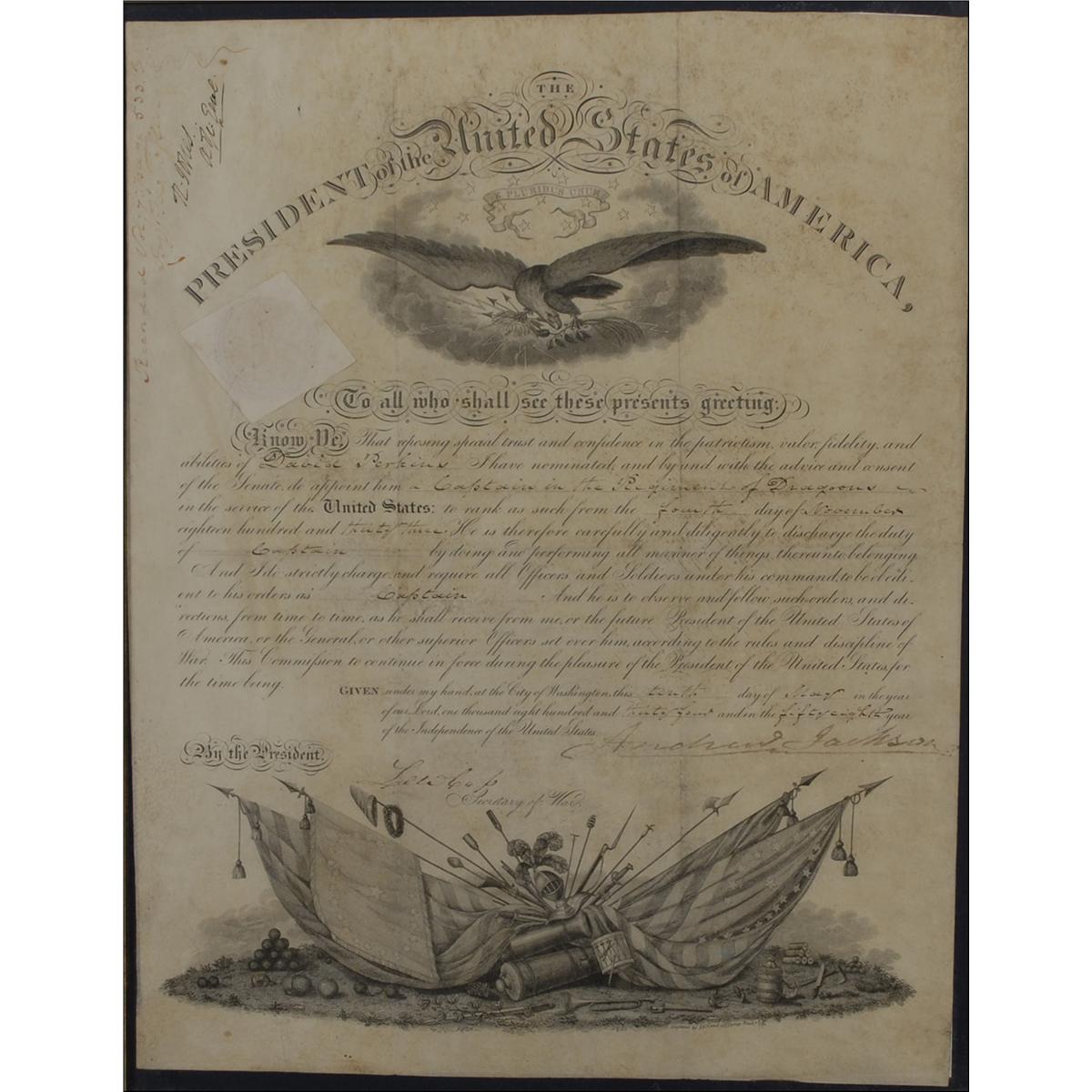 Partly-printed DS as president, one page, 13.5 x 17.5, May 10, 1834. President Jackson appoints David Perkins “a Captain in the Regiment of Dragoons.” Signed at the conclusion by Jackson and countersigned by Secretary of War Lewis Cass. Cloth matted and framed with a color portrait of Jackson and a small descriptive plaque, to an overall size of 32.75 x 26.5. In very good condition, with intersecting folds, one through a single letter of signature, scattered toning and soiling, a few pinholes of paper loss along folds, and a few wrinkles. The paper seal is slightly worn, but intact and Jackson’s signature measures 6.5 inches long. Oversized.