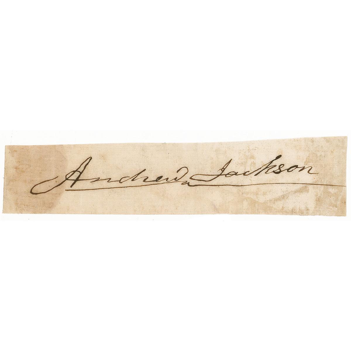 Large six inch ink signature, “Andrew Jackson,” on an off-white 6.5 x 1.5 clipped slip which has been professionally silked. Scattered light toning and a vertical crease between first and last name, otherwise fine condition.