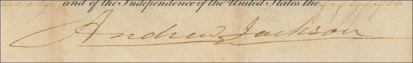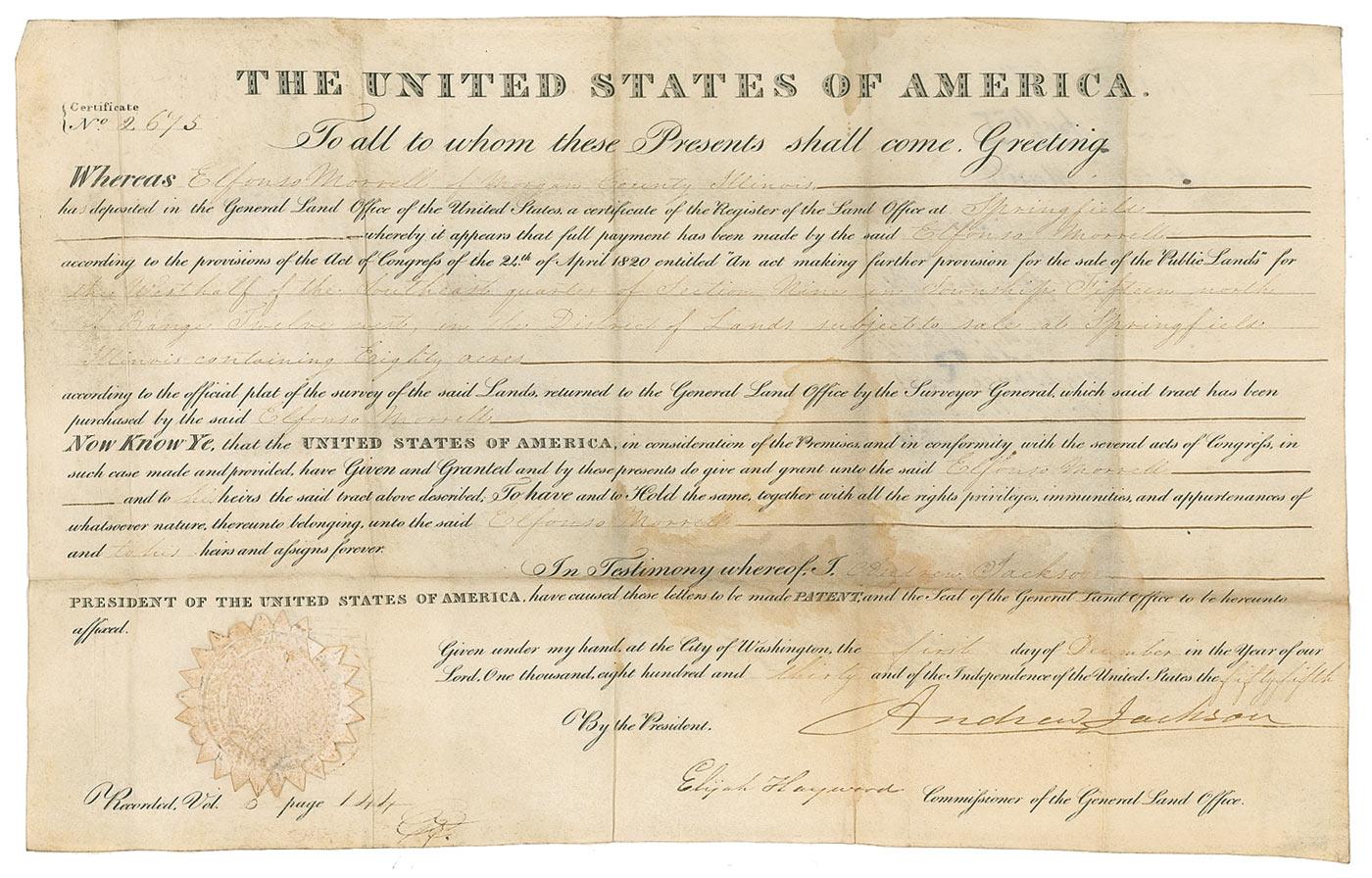 Partly-printed DS as president, one page, 15.5 x 10, December 1, 1830. President Jackson grants Elfonso Morrell 80 acres of land in Springfield, Illinois. Signed at the conclusion by Jackson, and countersigned by Commissioner of the General Land Office Elijah Hayward. In very good condition, with intersecting storage folds, two through single letters of signature, scattered toning, and written portions of the document fairly light, but mostly legible. The white paper seal is toned but intact, and Jackson’s signature measures about 6.5 inches long.