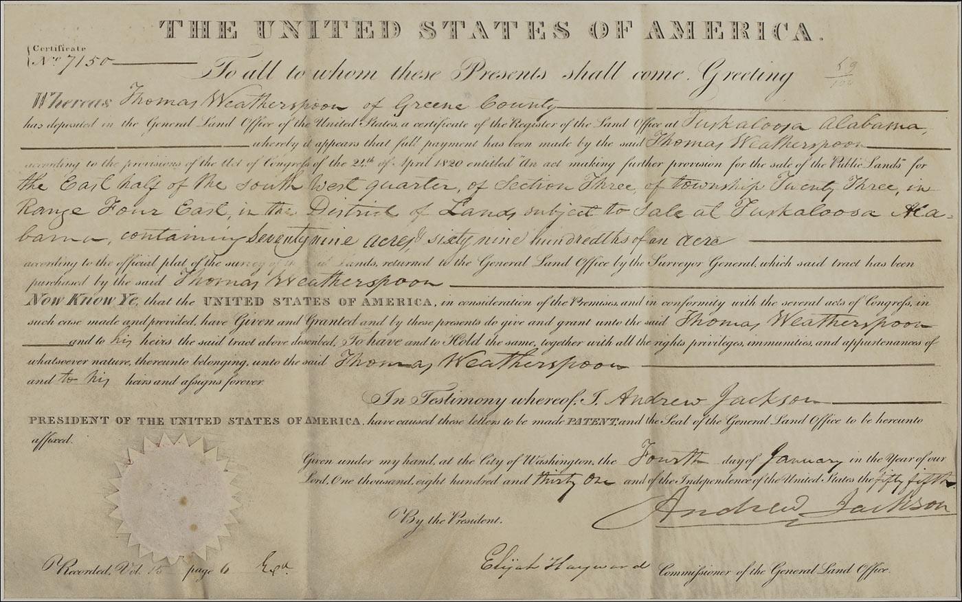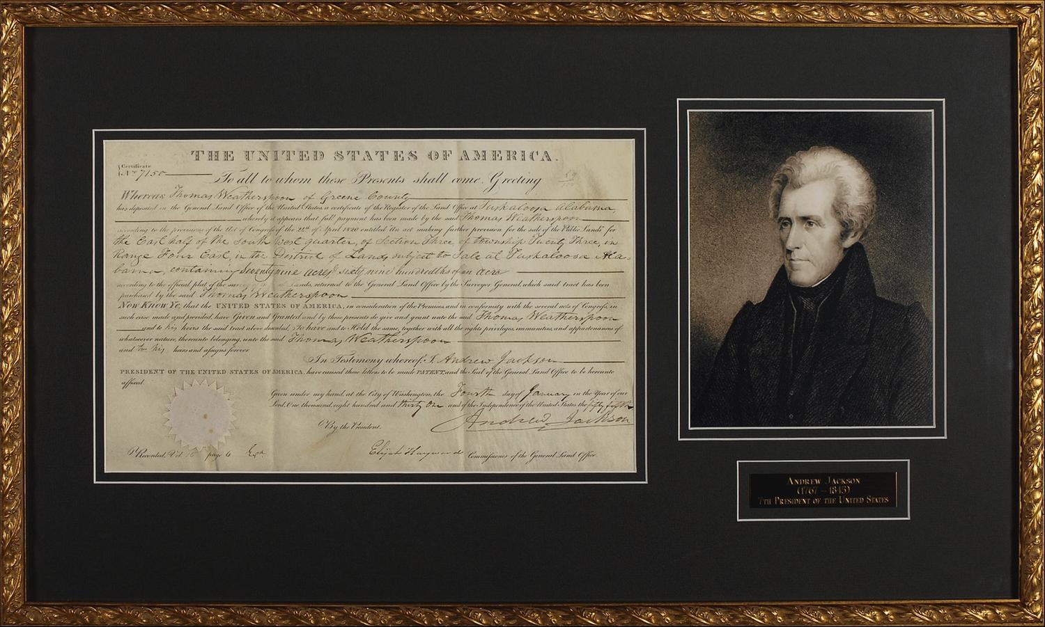 Partly-printed DS as president, one page, 15.25 x 9.5, January 4, 1831. Jackson grants almost 80 acres of land in Greene County to Thomas Weatherspoon. Signed at the conclusion by Jackson and countersigned by Commissioner of the General Land Office Elijah Hayward. Archivally double matted and framed with a portrait of Jackson and a name plaque to an overall size of 30 x 18. In very good condition, with two vertical folds, one through a single letter of signature, some scattered light toning and soiling, light wrinkling, and a pencil notation near top. The white seal is worn, but intact and Jackson’s signature measures almost six inches in length. Oversized.