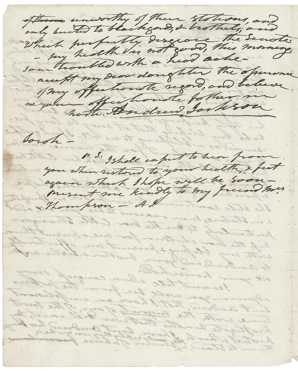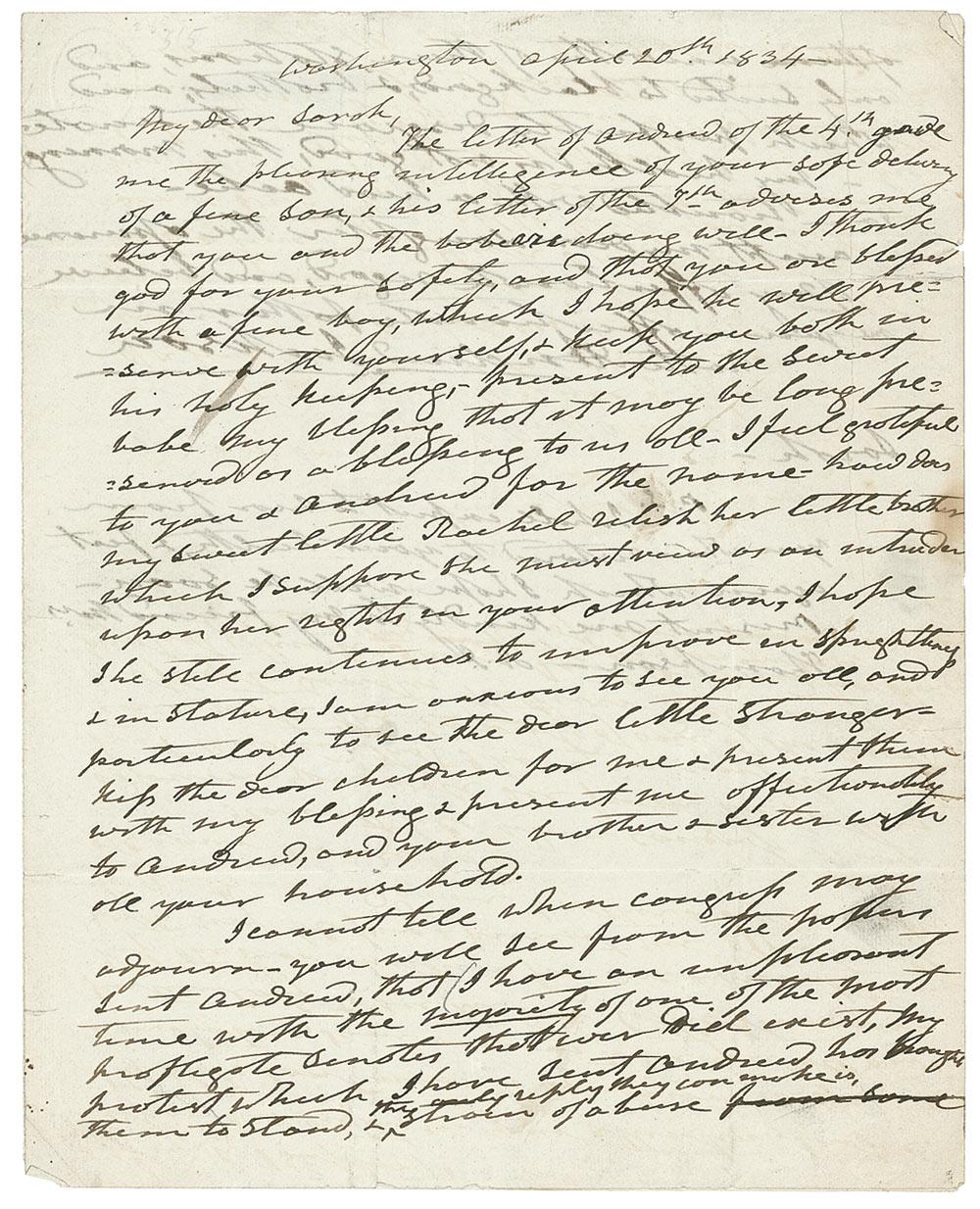 ALS as president, one page both sides, 8 x 9.75, April 20, 1834. Letter to his daughter-in-law Sarah Jackson. In full: “The letter of Andrew of the 4th gave me the pleasing intelligence of your safe delivery of a fine son, & his letter of the 7th advises me that you and the babe are doing well. I thank God for your safety, and that you are blessed with a fine boy, which I hope he will preserve with yourself, & keep you both in his holy keeping, –present to the sweet babe my blessing that it may be long preserved as a blessing to us all. I feel grateful to you & Andrew for the name–how does my sweet little Rachel relish her little brother which I suppose she must view as an intruder upon her rights in your attention. I hope she still continues to improve in sprightliness and in stature, I am anxious to see you all, and particularly to see the dear little stranger–kiss the dear children for me & present them with my blessing & present me affectionately to Andrew, and your brother & sister with all your household. I cannot tell when congress may adjourn–you will see from the papers sent Andrew, that I have an unpleasant time with the majority of one of the most profligate senates that ever did exist, my protest which I have sent Andrew has brought them to stand, & the only reply they can make is, strain of abuse unworthy of their stations, and only suited to blackguards, & brothels; and which perfectly disgrace the senate. My health is not good, this morning I am troubled with a headache. Accept my dear daughter the assurance of my affectionate regard, and believe me your affectionate father, in haste.” Under his signature, Jackson pens a postscript, which reads: “Sarah–P.S. I shall expect to hear from you when restored to your health, & feet again which I hope will be soon– present me kindly to my friend Mrs. Thompson–A.J.” In very good condition, with some splitting along the intersecting folds (a couple folds pass through a single letter of the signature), light show-through from text on opposing sides, light soiling, and a small area of staining to each page. The second integral page bears an address panel in another hand, and black seal remnant. Jackson found himself mired in Washington politics when he wrote this letter, separated from his newborn grandchild but, more importantly, facing a Constitutional crisis via the first-ever censure of a US president. A still-gray area of Constitutional law, some legal experts maintain that the censure of a president violates a bill of attainder, finding the chief executive guilty of a crime without the benefit of a trial. None of that mattered in 1834, however, as Jackson found himself at odds with his political opponents, particularly Senator Henry Clay of Kentucky, who disapproved of Jackson’s “tyrannical” policies. The political stress of this “unpleasant time,” as noted here by the president, came to a head about three weeks before this correspondence when the Senate reprimanded Jackson for allegedly assuming unconstitutional power by vetoing the National Bank’s re-chartering and ordering its deposits to be removed. In spite of the political wrangling, Jackson showed no sign of wavering from his stance, pointing the finger at Clay and his allies for abusing their senatorial power. Although Clay had hoped that the censure would ruin Old Hickory’s political career, it merely strengthened the president’s resolve, and his new vision of the presidency focused the purpose of the Democratic Party. A sentimental note by a sitting president penned during a time of political crisis.