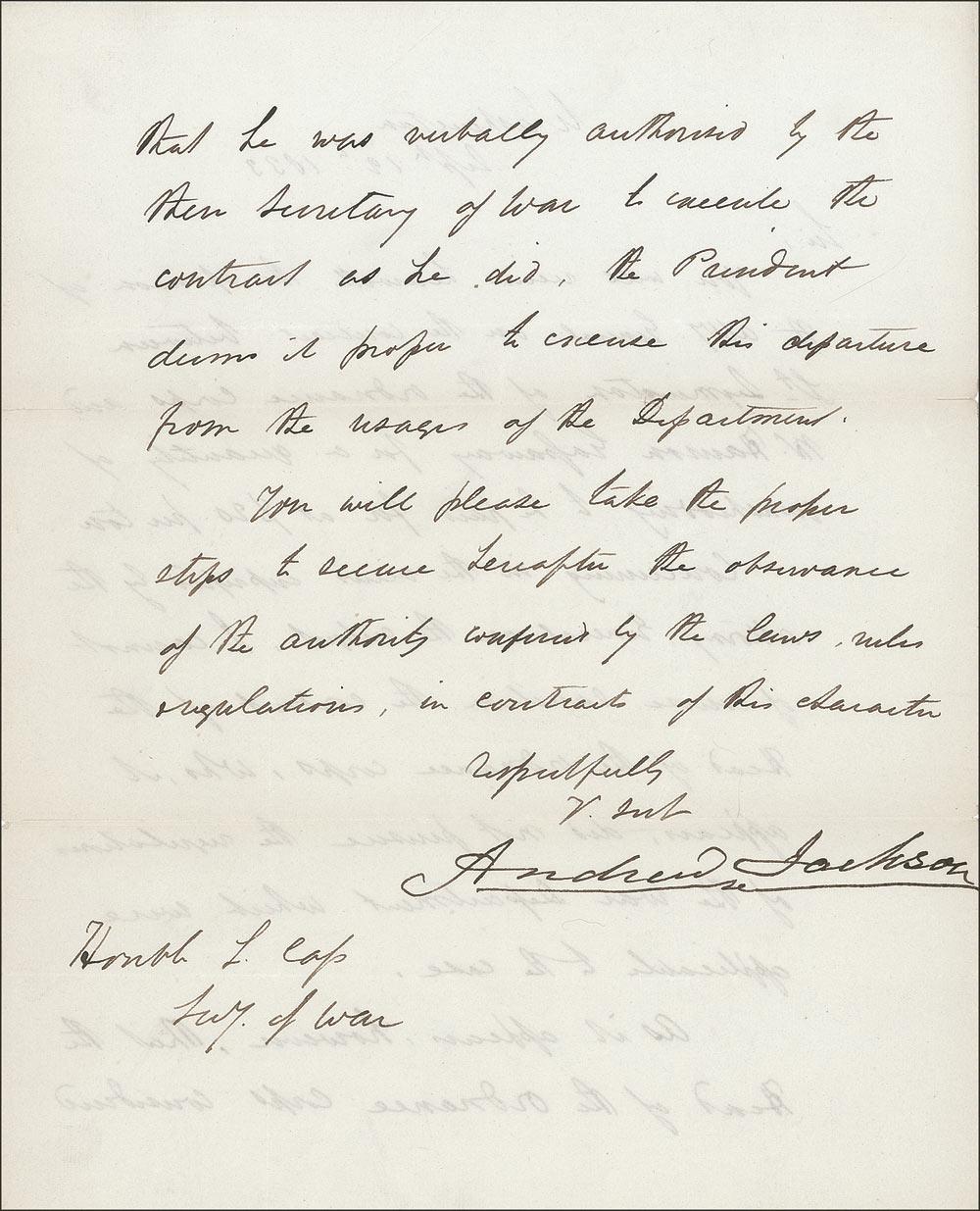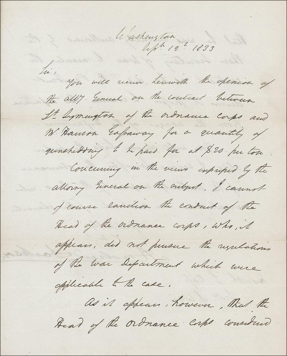 LS, one page both sides, 8 x 10, September 12, 1833. Letter to his Secretary of War Lewis Cass on the opinion of Attorney General, and future Chief Justice, Roger Taney. In full:“You will receive herewith the opinion of the Atty. General on the contract between Lt. Symington of the ordnance corps and Mr. Harmon Gassaway for a quantity of gunshedding to be paid for at $ 20. Per ton.