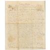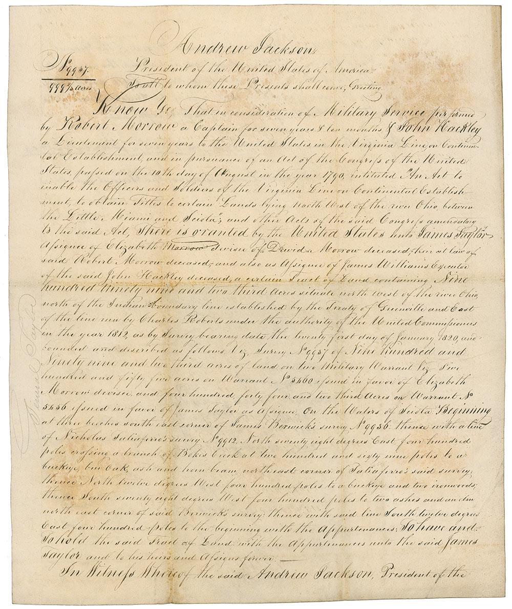 Manuscript vellum DS as president, one page both sides, 12 x 14.5, April 5, 1832. “In consideration of Military Service,” Jackson grants a four hundred acre parcel of land to Robert Morrow, “a Captain for seven years & ten months & John Hackley a Lieutenant for seven years to the United States in the Virginia Line.” Nicely signed at the conclusion by Jackson and countersigned by Elijah Haywood as commissioner of the general land office. In very good condition, intersecting folds, one through a single letter of signature, scattered toning and soiling, including several circular areas from seal, and scattered creases and wrinkles. Jackson was the last president to routinely sign these land grants. He finally stopped altogether, paving the way for all future presidents. An unusual format with Jackson’s signature measuring just over six inches long.