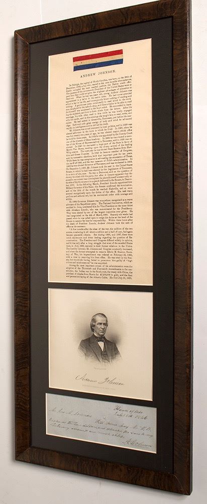 Framed autograph note from Andrew Johnson. Datelined House of Reps, July 25, 1846, Johnson instructs John M Johnson payment to W.B. Dickanas $13. At the time, Johnson was a Congressman from Tennessee. He succeeded Lincoln after the assassination. Beautifully framed with attendant information on Johnson. Date: Location: HWAC # 55963