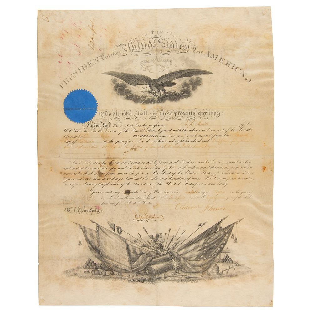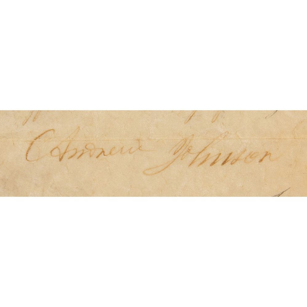 Partly-printed vellum DS as president, signed “Andrew Johnson,” one page, 15 x 19, April 20, 1865. President Johnson confers on "A. H. Merritt of the U. S. Volunteers, in the service of the United States, by and with the advise and consent of the Senate, the rank of Major by Brevet…for gallant and distinguished services at the battles of Laurel Hill and Peebles Farm, Virginia." Signed at the conclusion in ink by President Andrew Johnson and countersigned by Secretary of War Edwin M. Stanton. Retains the blue seal affixed to the upper left. In very good to fine condition, with scattered staining, soiling, and the signature several shades light. Johnson had ascended to the presidency only five days earlier, and Lincoln's assassin was still on the run. With this document, Johnson attends to his duties as commander-in-chief, recognizing the bravery of a Union soldier during the Siege of Petersburg. A supremely desirable document from a moment of upheaval in the United States.