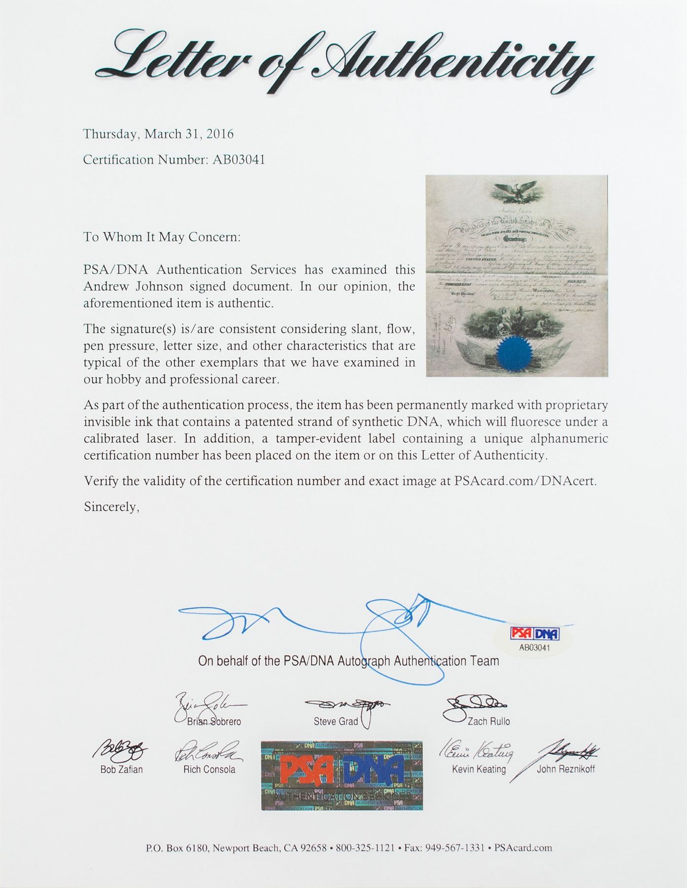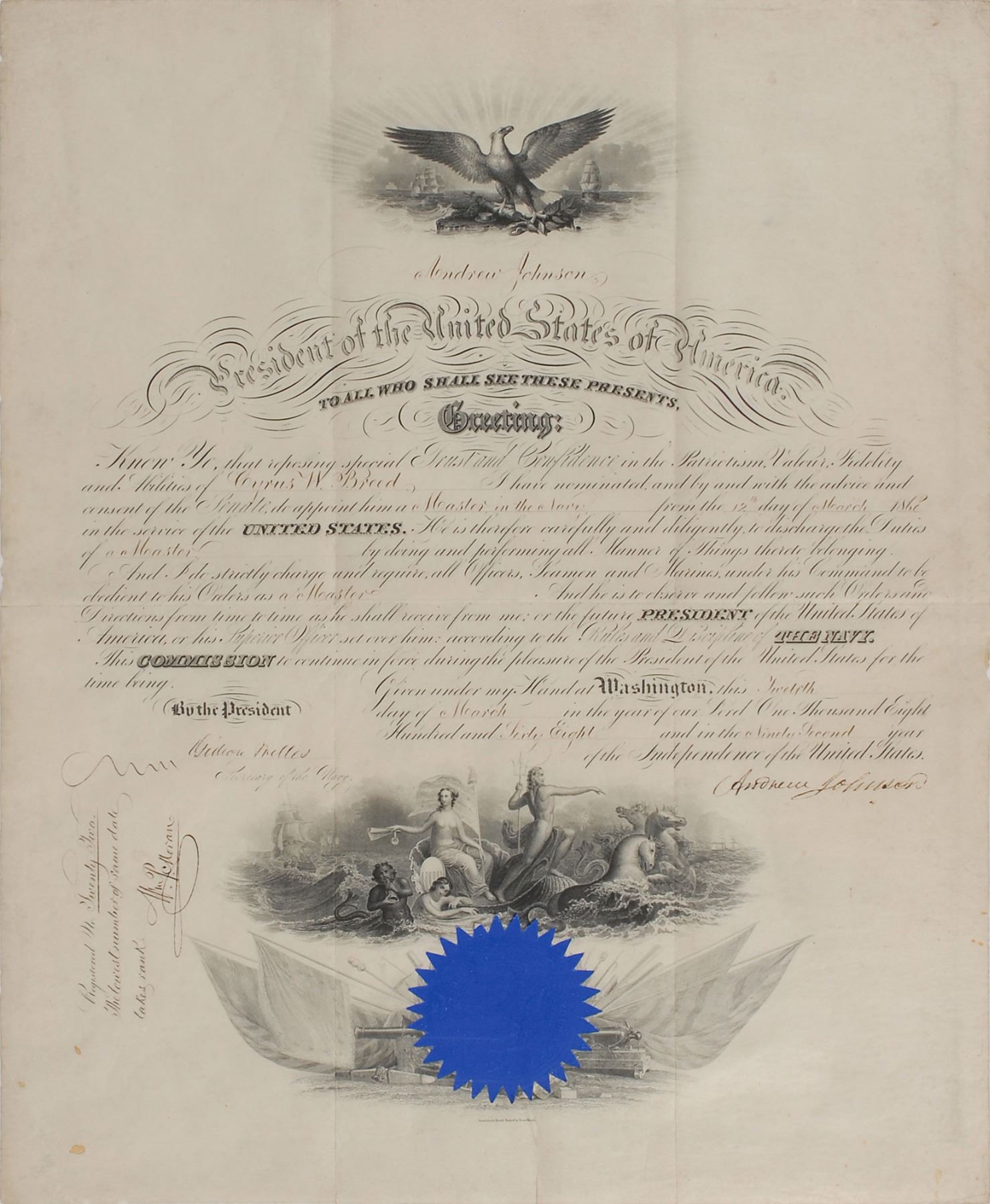 Partly-printed vellum DS as president, one page, 15.75 x 19.5, March 12, 1868. President Johnson appoints Cyrus W. Breed as "Master in the Navy from the 12th day of March 1868 in the service of the United States." Signed at the conclusion by Andrew Johnson, and countersigned by Gideon Welles as secretary of the Navy. Embossed blue seal affixed to lower center remains intact. In fine condition, with a few small stains to lower left blank area. Accompanied by a full letter of authenticity from PSA/DNA.