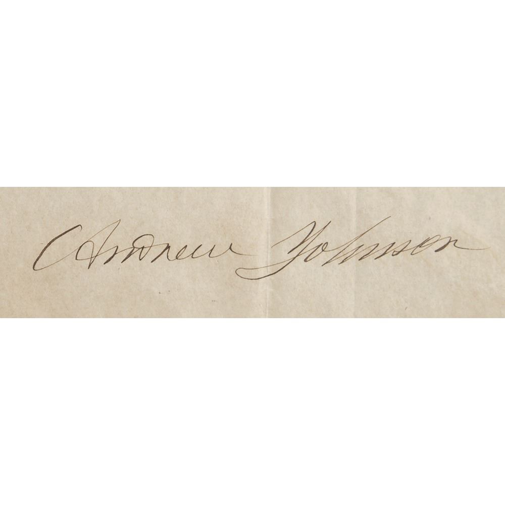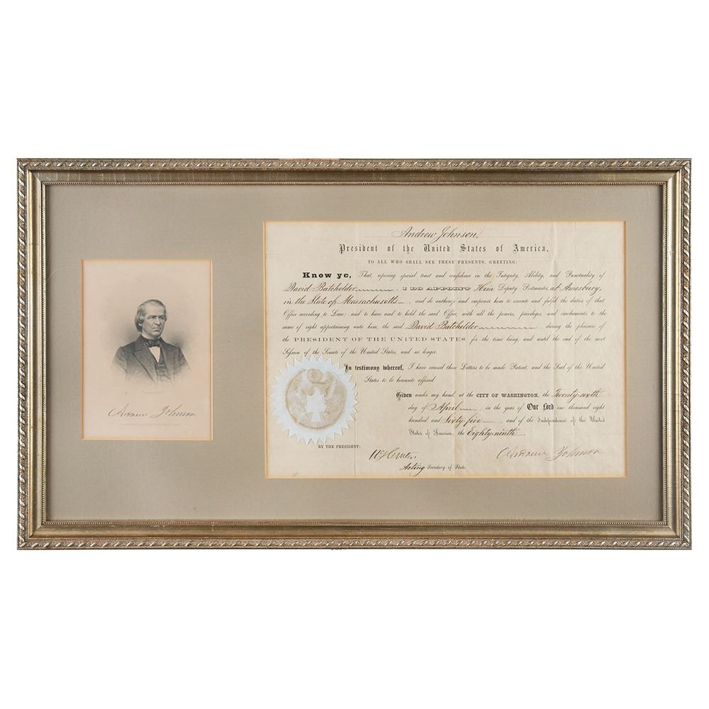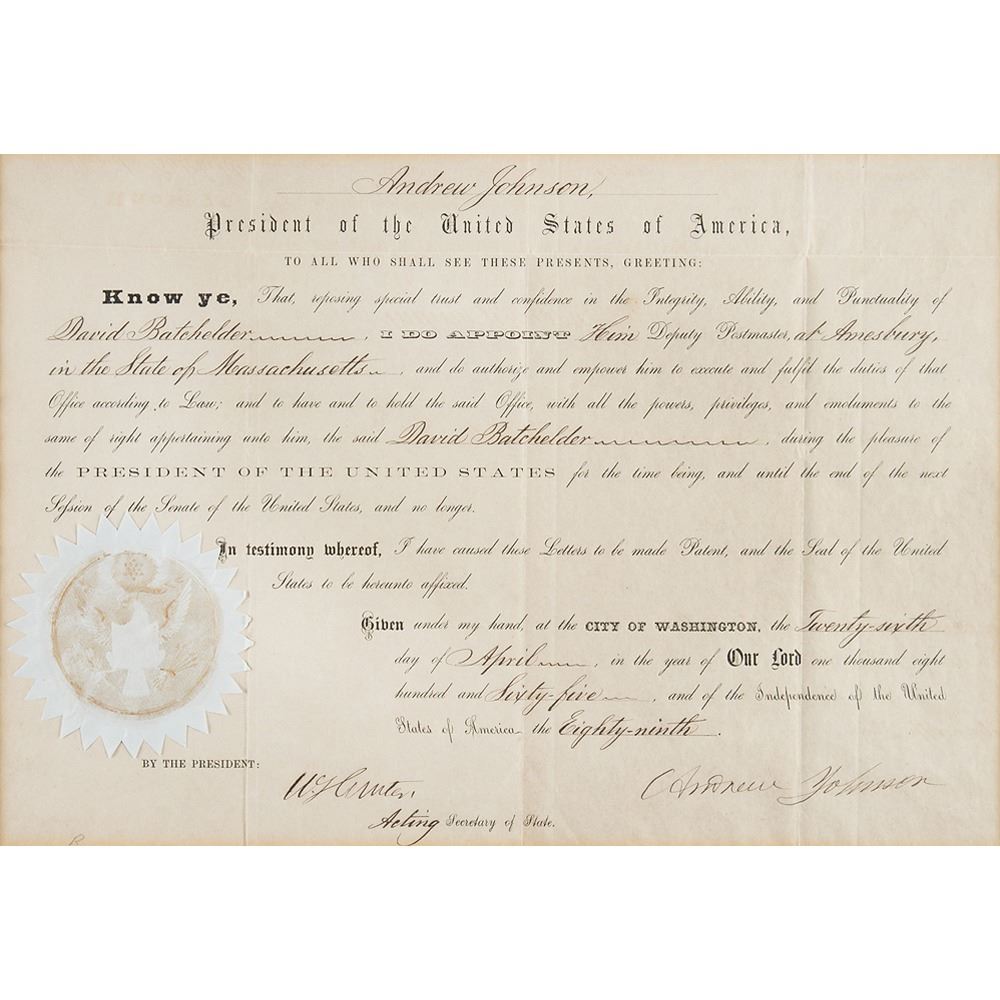 DS as president, one page, 13.25 x 9.25, April 26, 1865. President Johnson appoints David Batchelder as "Deputy Postmaster at Amesbury, Massachusetts." Neatly signed at the conclusion in bold ink by President Jackson, and countersigned by Acting Secretary of State William Hunter. The embossed white seal affixed to the lower left is toned but intact. Handsomely matted and framed with an engraved portrait (bearing a facsimile signature) to an overall size of 24.5 x 14. In fine condition, with intersecting folds. This historic document dates to just eleven days after Andrew Johnson took office upon the assassination of Abraham Lincoln; Secretary of State William H. Seward, who had been attacked as part of the assassination conspiracy, was still recuperating, with Hunter acting in his stead. On this date, John Wilkes Booth was apprehended and killed after a days-long manhunt that ended in Port Royal, Virginia.