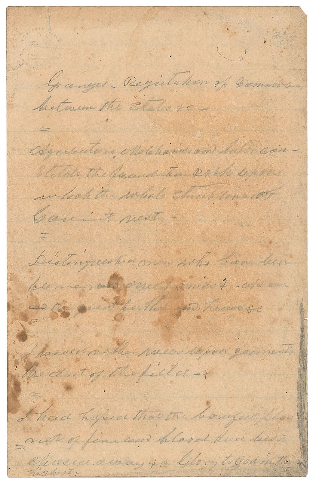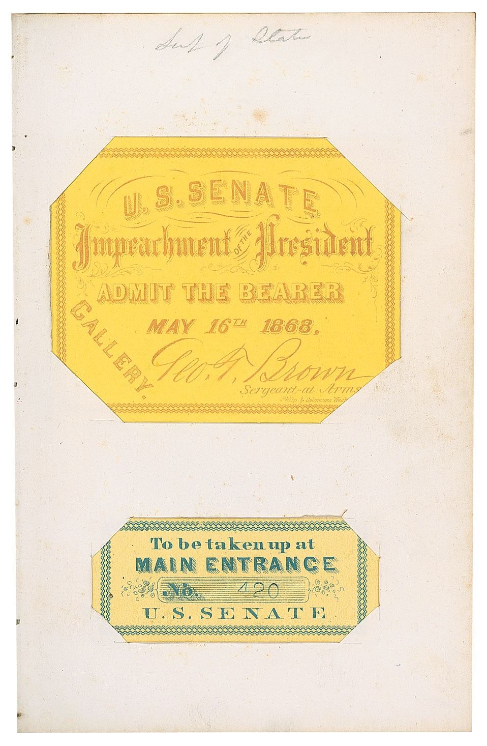 Two items, including a handwritten draft in pencil by Johnson and a leatherbound autograph book containing a ticket to his impeachment hearings. Handwritten manuscript in pencil by Andrew Johnson, unsigned, one page both sides, 5.25 x 8.25, no date but ostensibly as president circa 1868–1869, given the presence of a Congressional seal to the upper left corner. The manuscript, likely written as a speech draft, is headed "Debt of the State," and reads, in part: "Agriculturalists and mechanics are somewhat interested in high taxes…Debt of the U. S…ample for the purposes of the people. President to be elected by the people and the election of Senators to be taken from the Legislature. Reference to myself I hope will not be indelicate. Betrayed by the Legislature and defeated. Washington had his Arnold, Jefferson, Burr, Caesar his Brutus &c. (The ladies God bless them &c). I am ambitious and would not be worthy of myself. Granges, Registration of Commerce between the states &c. Agriculture, Mechanics and labor constitute the foundation rock upon which the whole structure of Government rests. Distinguished men who have been farmers and mechanics & Adam and the great father…I would rather…upon governments the dust of the field &c…I had hoped that the baneful planet of fire and blood have been chased away &c Glory to God in the highest."